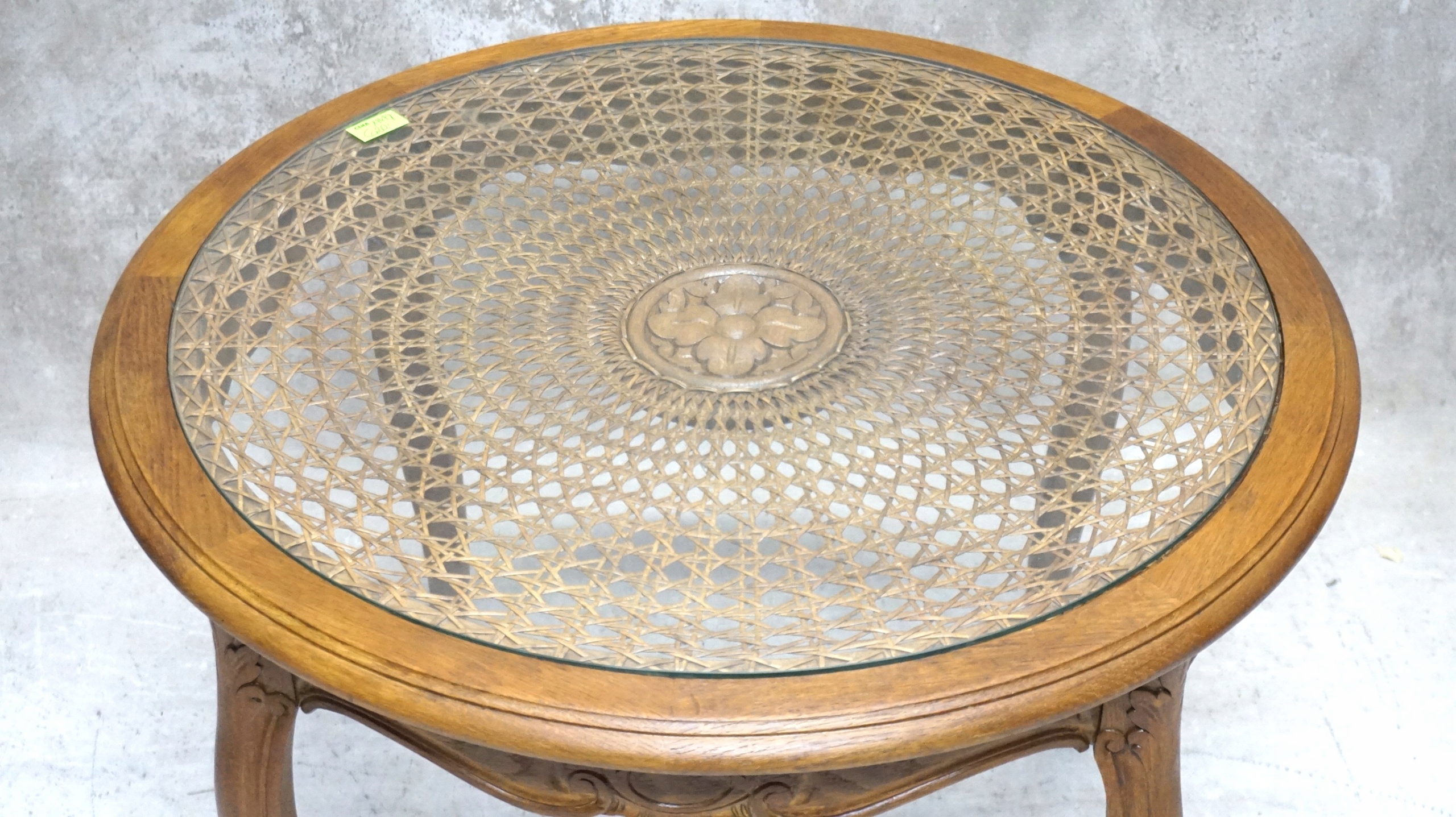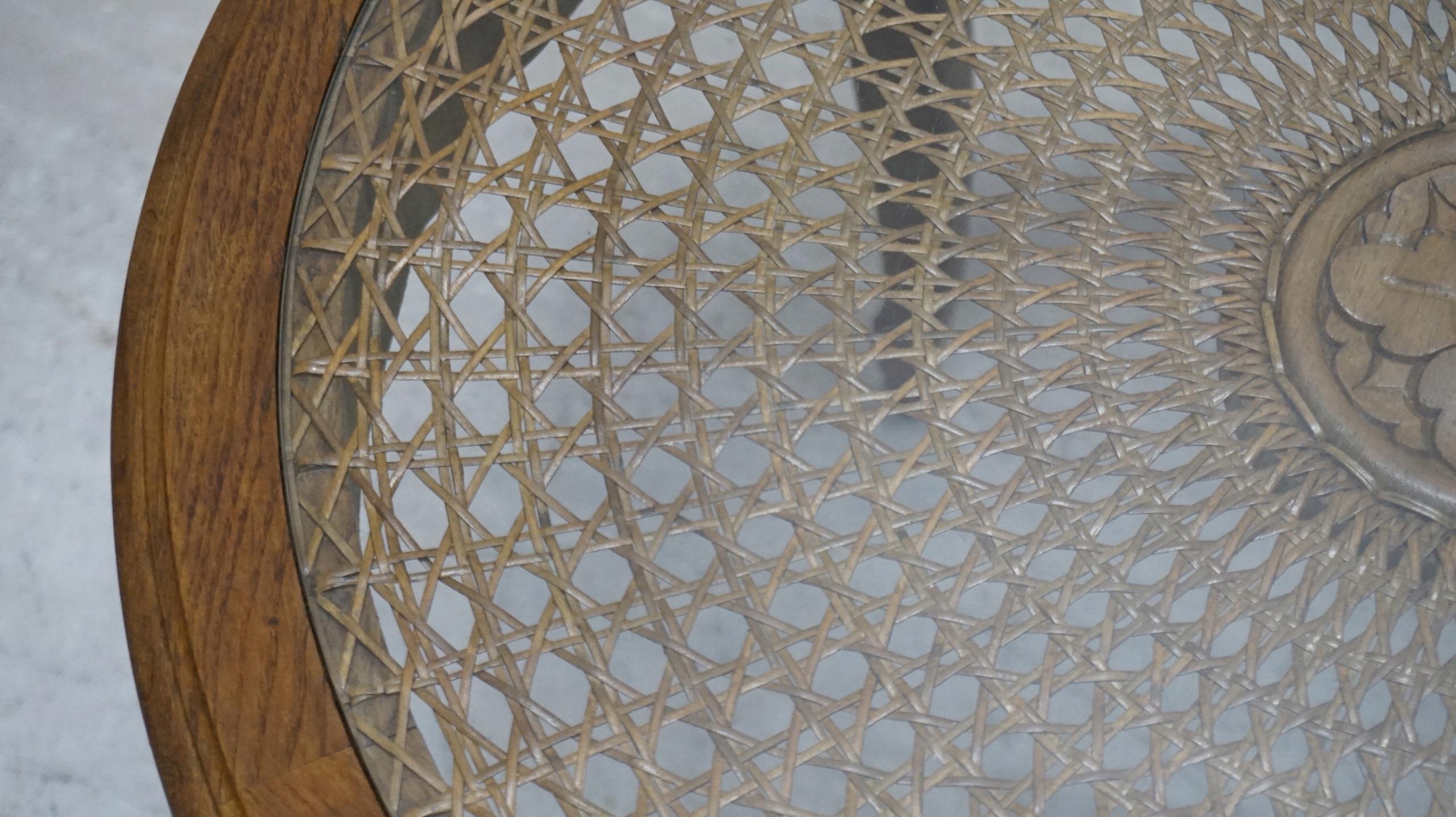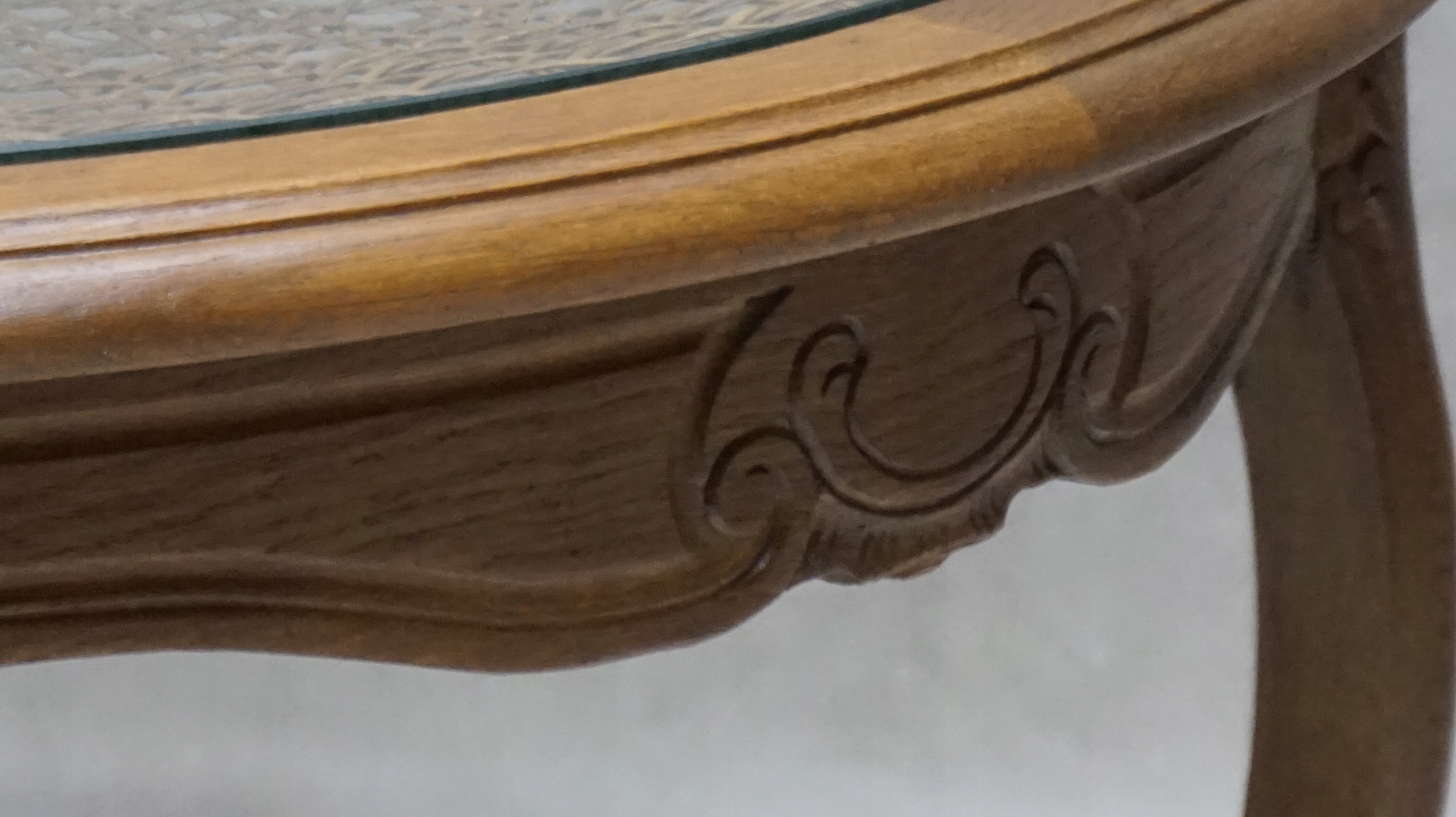 Стільниця з плетеної рафії, з декоративною різьбленою розеткою, скло зверху.