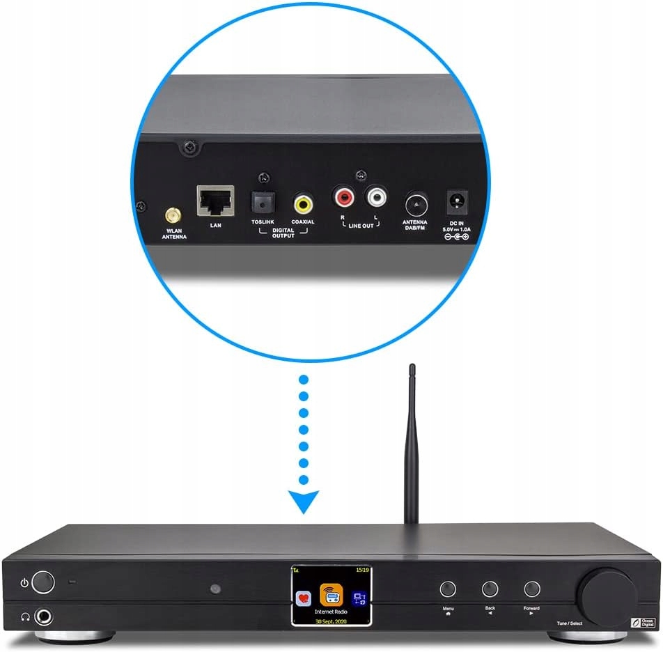 - Отримайте доступ до тисяч станцій по всьому світу через Інтернет через Wi-Fi або Ethernet (LAN RJ45). Персоналізовані списки відтворення можна створювати за допомогою 99 місць пам’яті або додавати за допомогою потокової передачі URL-адреси аудіо через комп’ютер