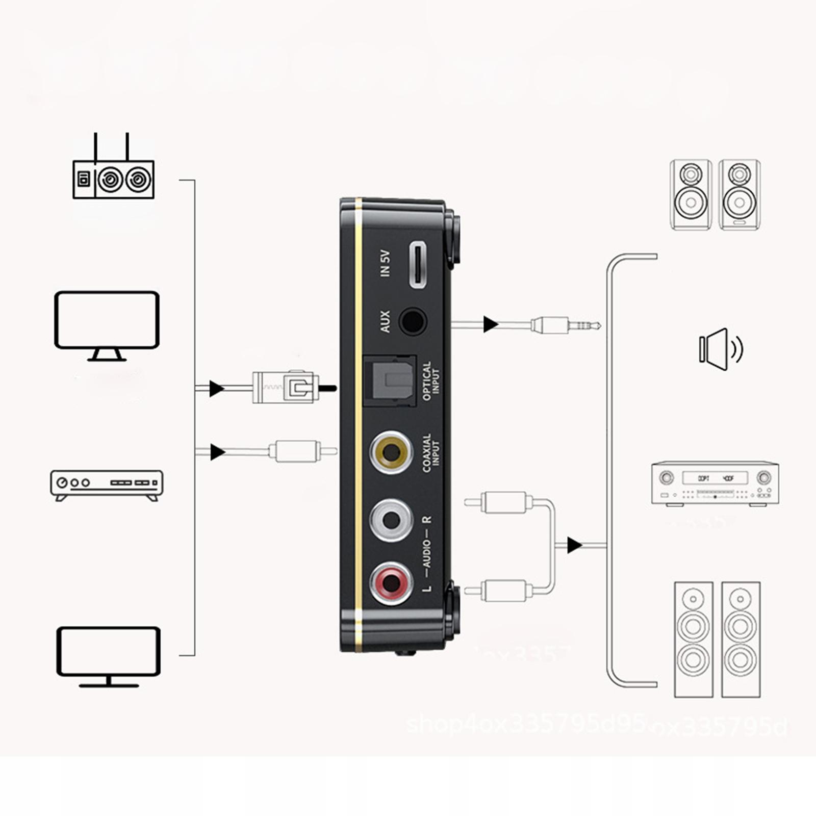Шість типів інтерфейсів, більш сумісні: AUX / RCA / цифровий оптичний / коаксіальний / U диск / TF, підтримка інфрачервоного дистанційного керування 5 ~ 8 метрів. Легко підтримує всі види аудіообладнання, мобільний телефон/планшет/комп’ютер/телевізор/динамік/підсилювач/навушники/проектор, мікшер тощо.