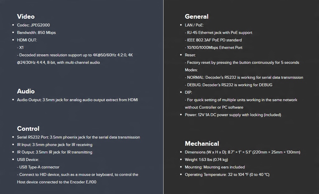 - Підтримка колірного простору 4:2:0 для роздільності до 4K60 Гнучкі параметри живлення PoE та постійного струму;