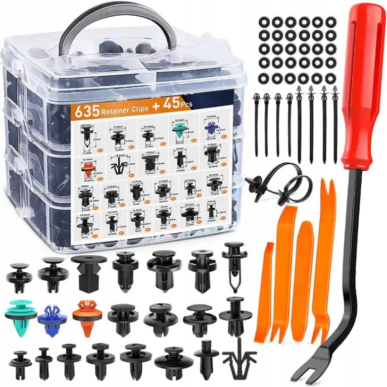 Наш набір включає цілих 680 різних елементів, включаючи різні види шпильок, шпильок, затискачів та додаткових інструментів. Все, що вам потрібно для ремонту та оновлення оббивки вашого автомобіля, в одному наборі, готовому до негайного використання.