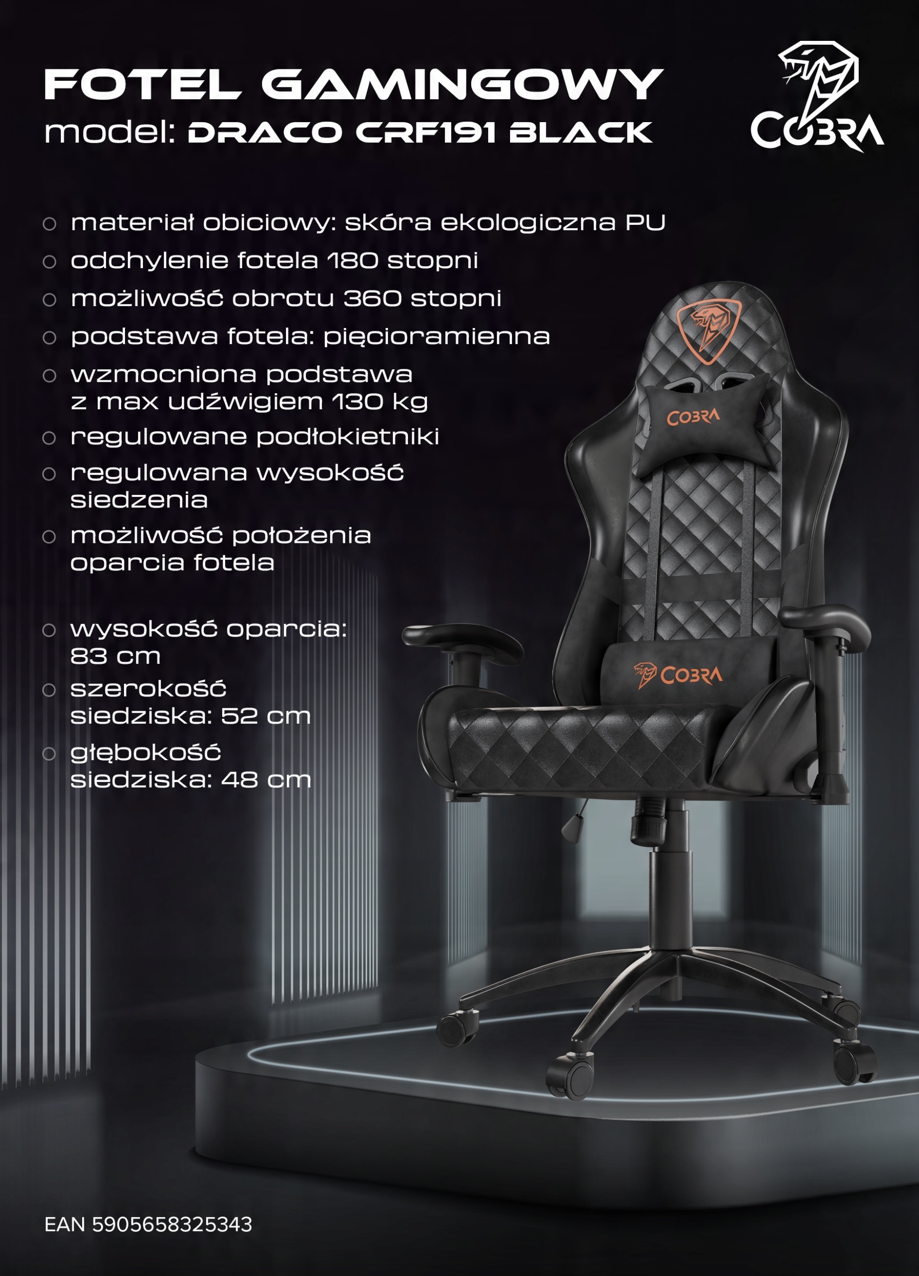 Ви шукаєте крісло, яке не тільки відповідатиме вашим вимогам, але й забезпечить дивовижний комфорт під час годин ігор? Meet Draco - ігрове крісло від бренду Cobra, створеного для найвибагливіших гравців. Оснащені новітніми технологіями та розроблені з увагою до кожної деталі, Драко змінить ваш підхід до ігор та працюватиме за столом!