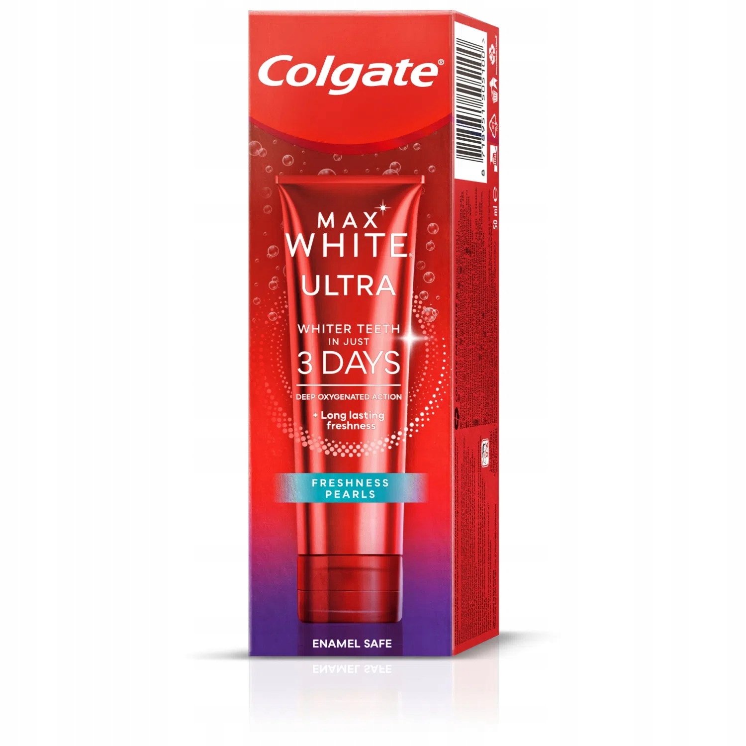 макаронні вироби Max Max White Ultra забезпечує біліші зуби за 3 дні та відбілювання глибокого знебарвлення, що спричиняє стирання емалі. Зурочення, максимальні білі перлини ультра свіжість на першій щітці вивільняють мільйони молекул активного кисню, які безпечно проникають по поверхні емалі, щоб видалити глибоке знебарвлення, спричинене їжею та напоєм. Забезпечує тривалу свіжість,