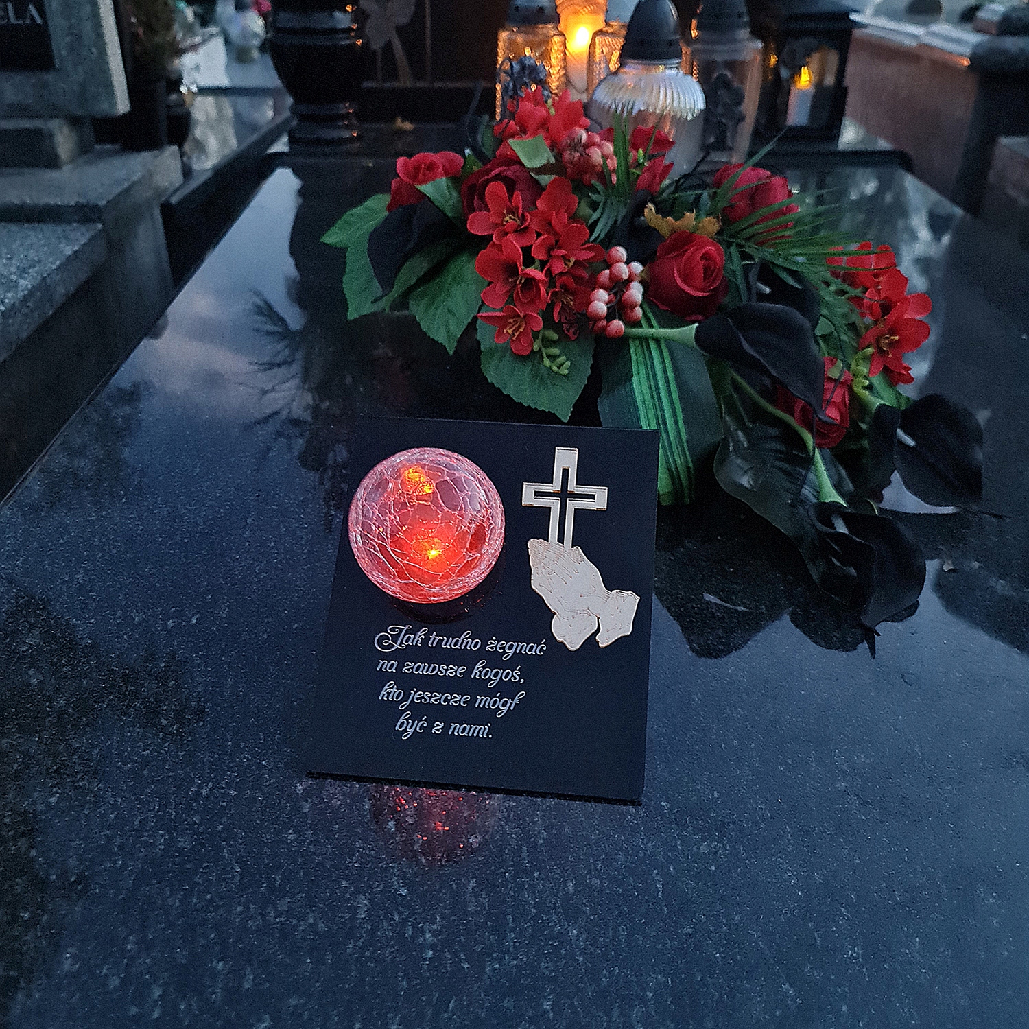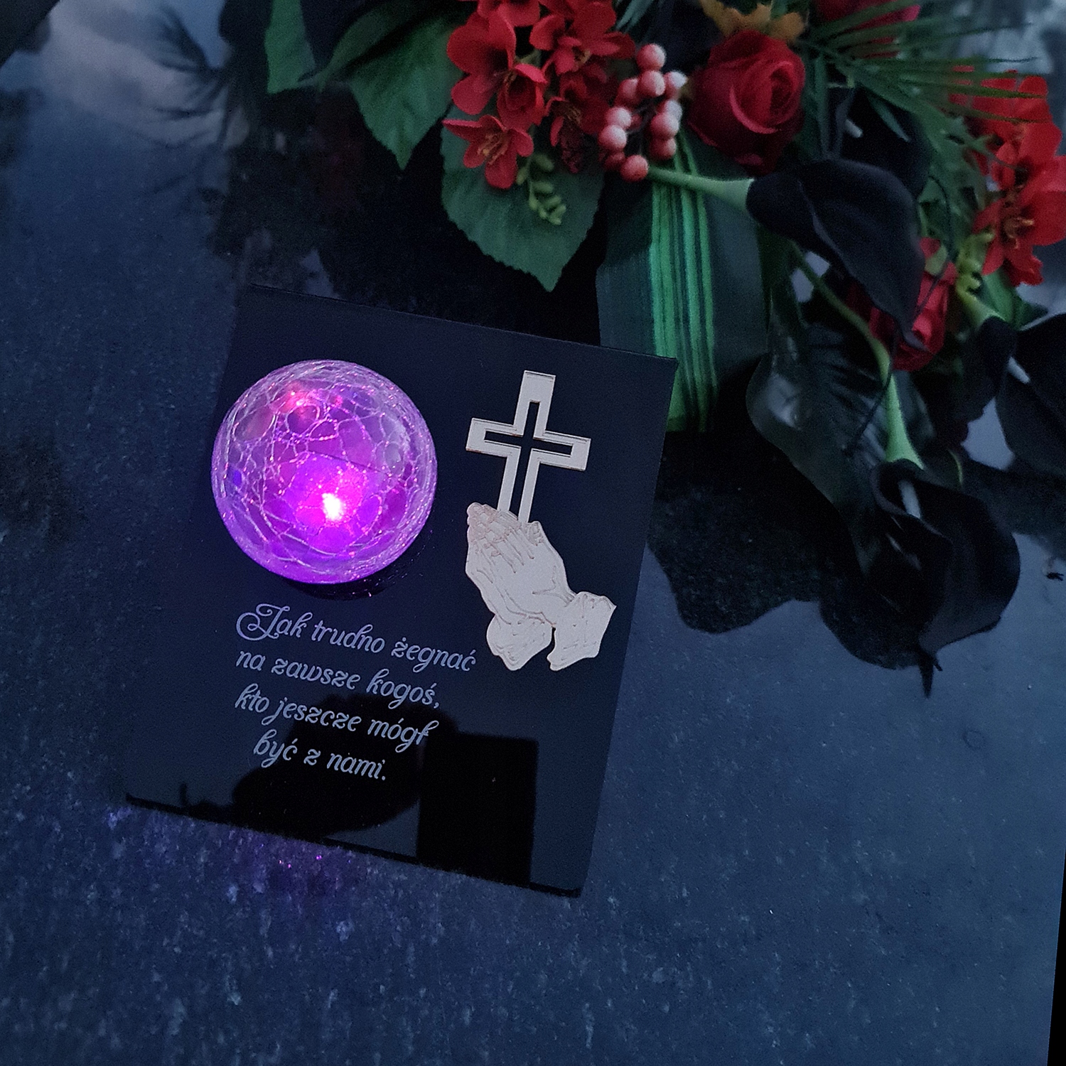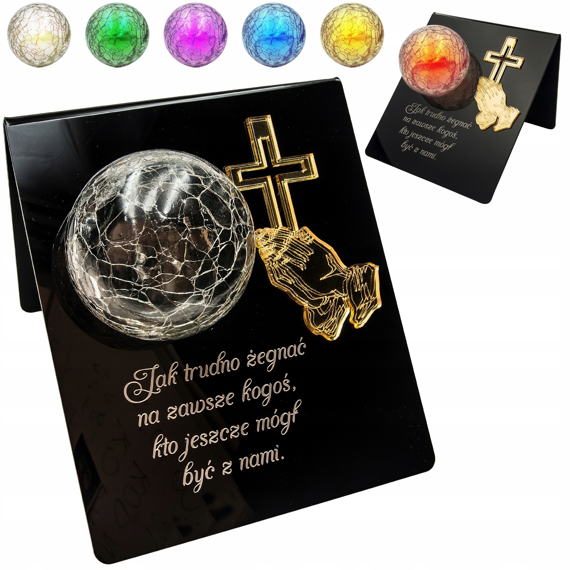 елегантна світлодіодна сонячна свічка для могили, яка світить у двох режимах: білий і барвистий RGB, з гравірованою акриловою скляною підставкою, прикрашеною золотим мотивом.