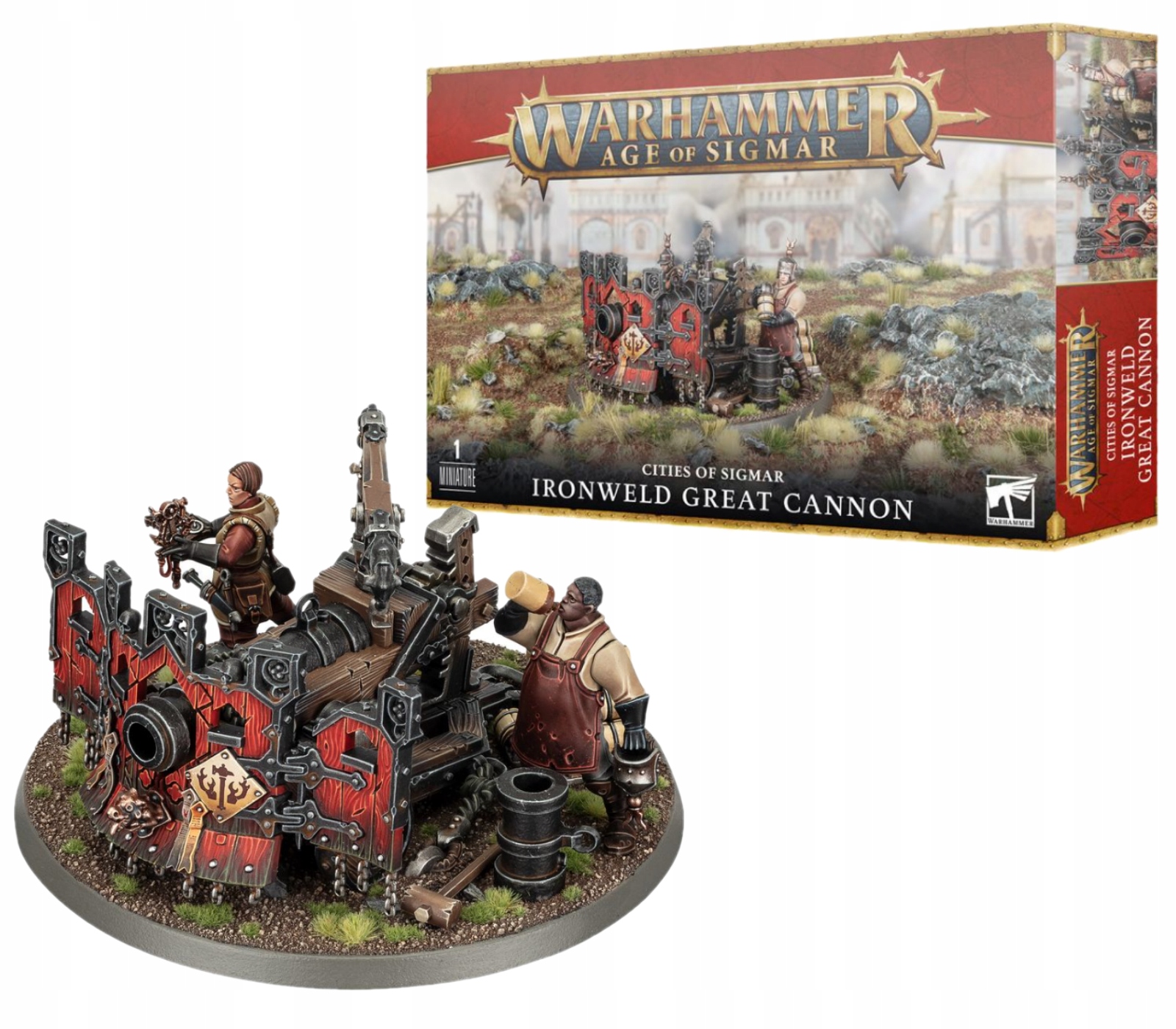 Великі гармати із залізного зварювання — це масивні артилерійські знаряддя, які діють як ревучі бастіони формування Кастелік. Захищений товстими дубовими гарматними щитами, прикріпленими до носової частини гармати, екіпаж невтомно заряджає, стріляє та перезаряджає свою зброю, щоб забезпечити постійний вогонь противника. Цей багатокомпонентний пластиковий набір дає змогу побудувати Велику Залізну Зварену Гармату, потужну бойову машину, яку використовують Міста Зігмара. Ця величезна рушниця встановлена на міцній дерев’яній рамі на колесах із лебідкою, яка утримується на місці ланцюгами, канатами та приводними стовпами. Екіпаж «Великої гармати» обслуговується двома стрільцями з Ironweld Arsenal, які пропонують різні варіанти кріплення для свого положення, голов і рук, що дозволяє створювати різноманітну батарею великих гармат. Ви також знайдете багато додаткових базових предметів, щоб налаштувати свою Велику Гармату, зокрема запасний конус, катапультний молот, стоси боєприпасів і окремі снаряди, які представляють три спеціальні навантаження: гарматне ядро, дроб із винограду та бронебійний снаряд.