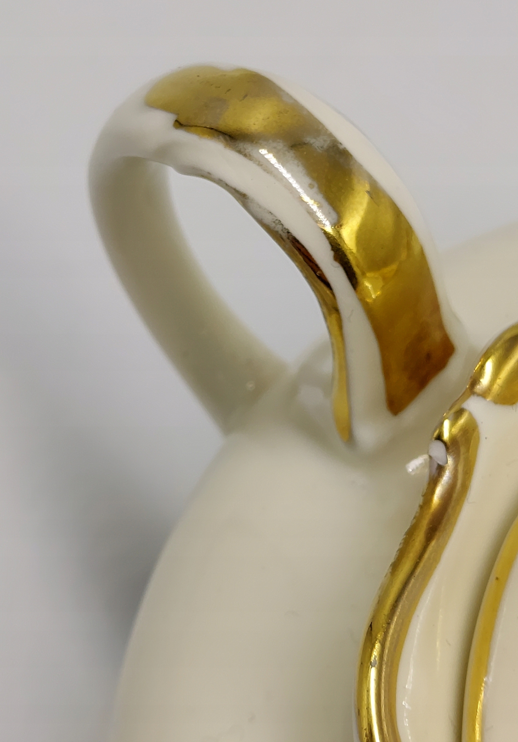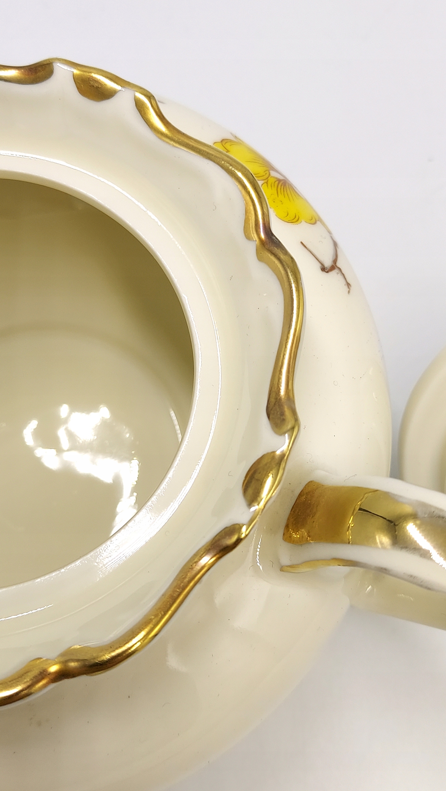 Цукорниця з високоякісна порцеляна кольору екрю. Красива форма, характерна для колекції Cavalier, опуклий живіт з елегантно профільованими краями біля основи та у верхній частині. Кульмінацією всієї форми є чудова ручка кришки, яка є її вінцем. В декорі зображені квіти форзиції, а цукорниця додатково прикрашена позолотою на ручках і обідках. Виглядає все це неймовірно вишукано та елегантно. Підпис внизу.