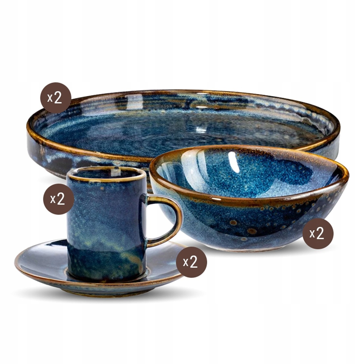 Верло глибоко -синій десерт для двох людей працює ідеально, коли подає кава та солодкі добавки. Він складається з двох плоских пластин, двох чашок для еспресо з блюдцями та двома стійками . Разом вони утворюють набір, який поєднує в собі зручність використання з унікальним виглядом.