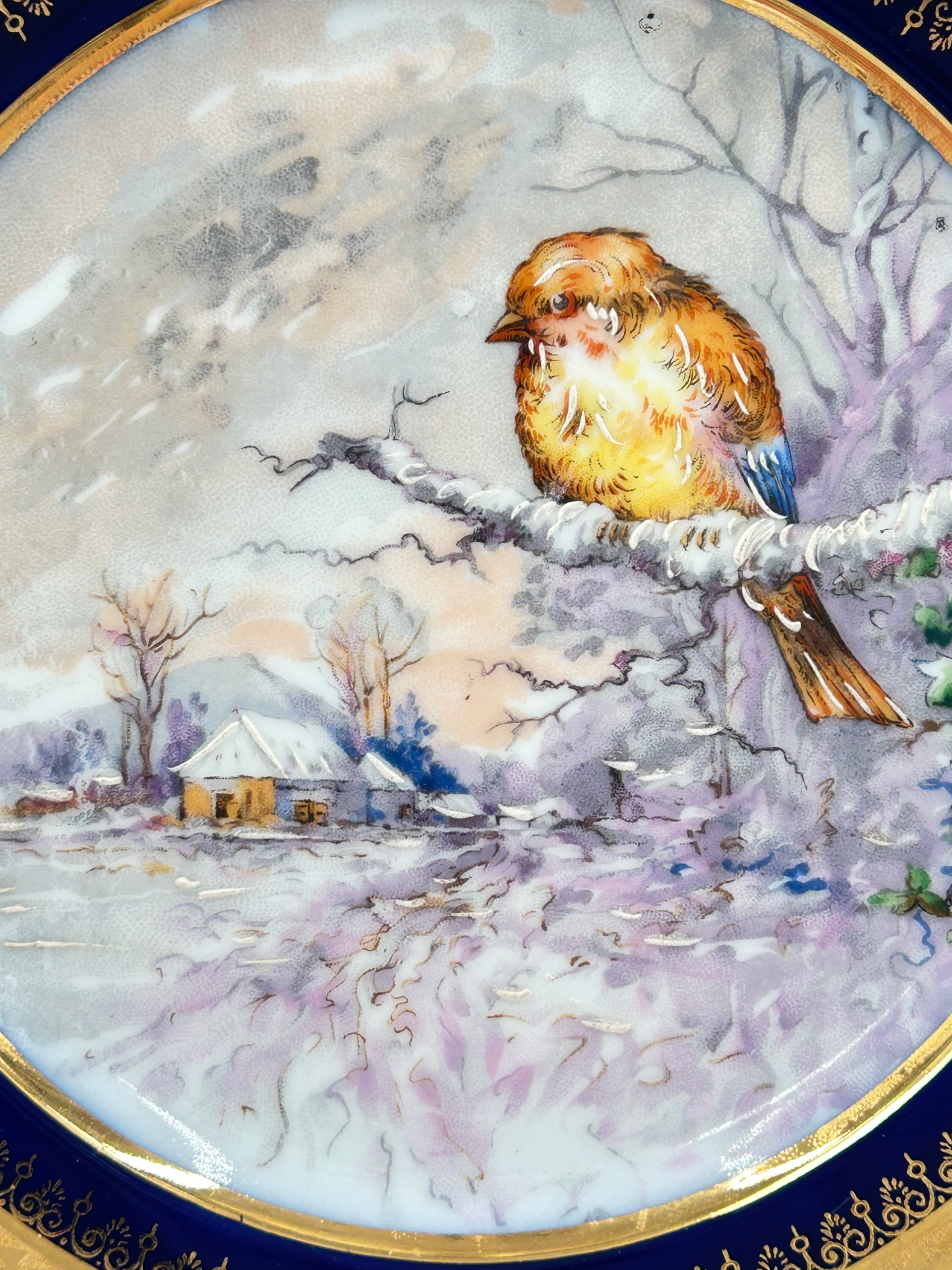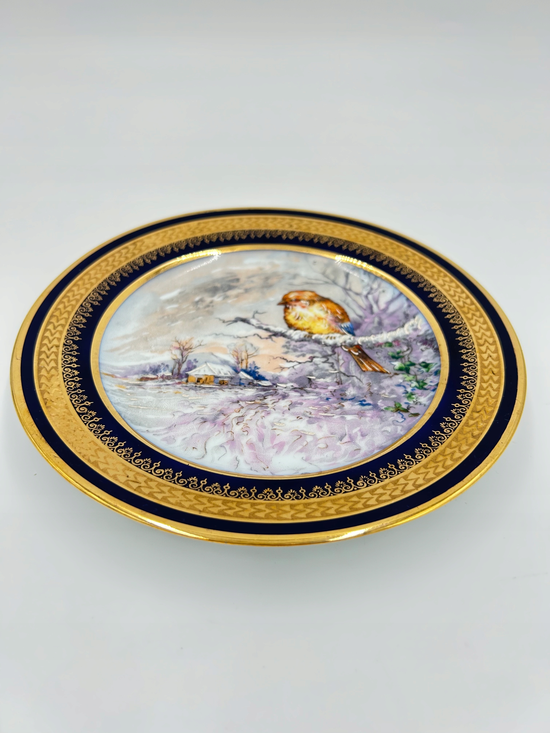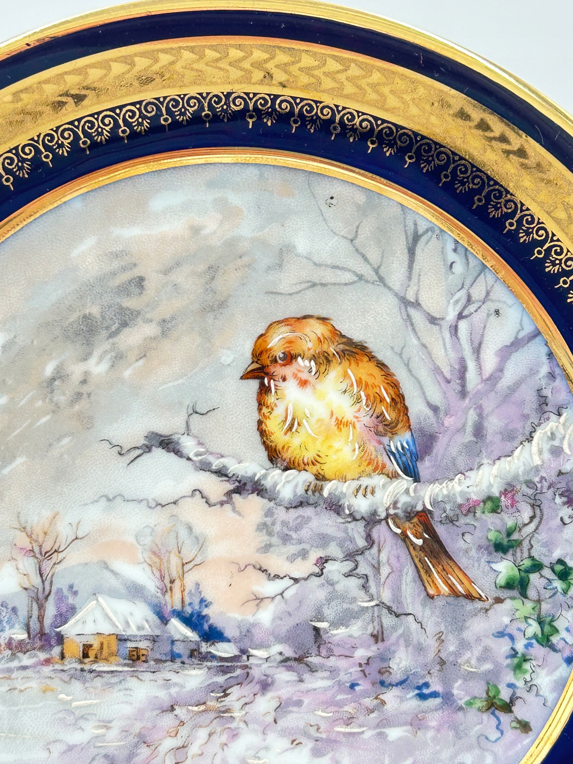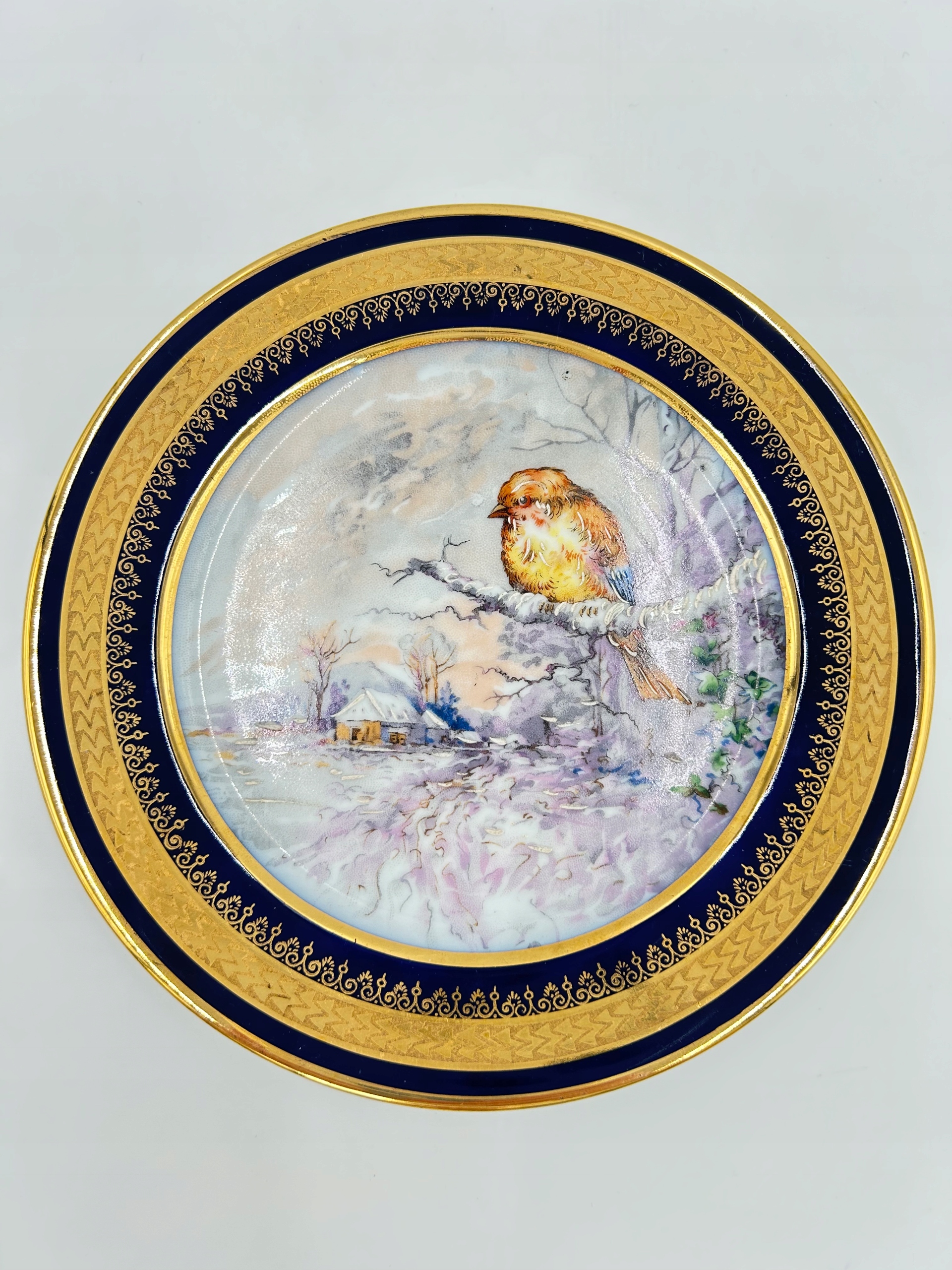 Тема продажу - це декоративна табличка від знаменитого французького виробництва Лімогес Франція . Інтер'єр, прикрашений зимовою сценою, крихітний птах сидить на гілці, на задньому плані ви можете побачити сільські будівлі. Тарілка, багата золотими прикрасами, берег у темно -синій. Я рекомендую прекрасний декоративний предмет, цінний копію колекціонера.