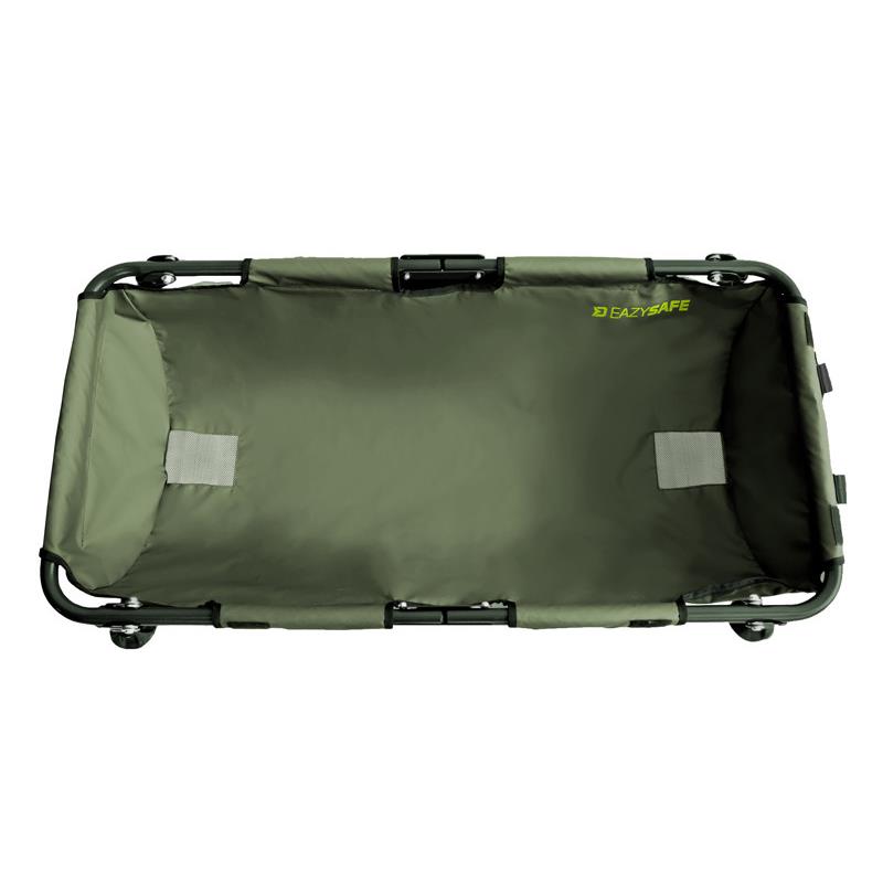 Базова колиска - це дуже сильна залізна конструкція з діаметром труби до 22 мм. Завдяки цьому він має чудову стабільність, і немає ризику його перекидання або пошкодження під час використання. Використовуваний гумовий поверхневий матеріал має кілька переваг. Просто протріть його сухим, і вам не доведеться довго чекати на висихання після риболовлі. Крім того, його дуже легко мити і не поглинають неприємні запахи, які можуть з’являтися у вашому автомобілі. Ціле дуже сильне, і під час екстремальних тестів він легко пережив статичну вагу до 75 кг! На обох краях вшивають сітчасту тканину, через яку вода витікає з внутрішньої сторони без проблем. Ezysafe має кришку липучки. Ноги оснащені елементами на суглобах, які адаптуються до місцевості, і запобігають падінню ґрунту на м'яку поверхню. Розробляючи цей продукт, ми також думали про транспорт, що є ще однією силою цього продукту. Всередині структура геніально розділена, тому просто складіть її навпіл і зручно рухатися ручками.