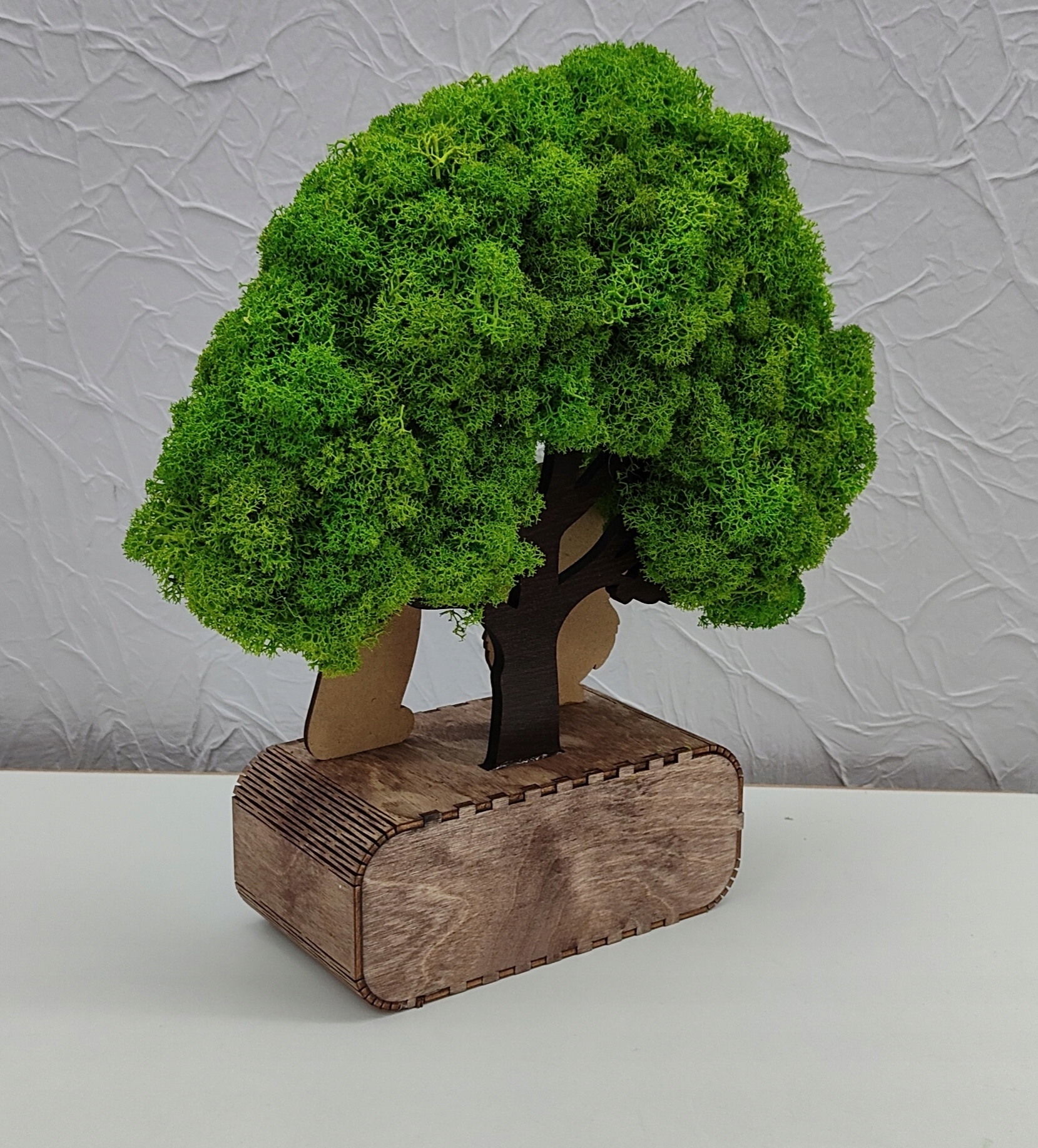 Стабілізований мох, який використовується для дерева, є чудовим лишайником і не потребує догляду. Його не потрібно обрізати і поливати. Для життя їй потрібна лише волога з повітря, яку вона сама поглинає. Може жити до 11 років. На вибір є кілька кольорів моху.