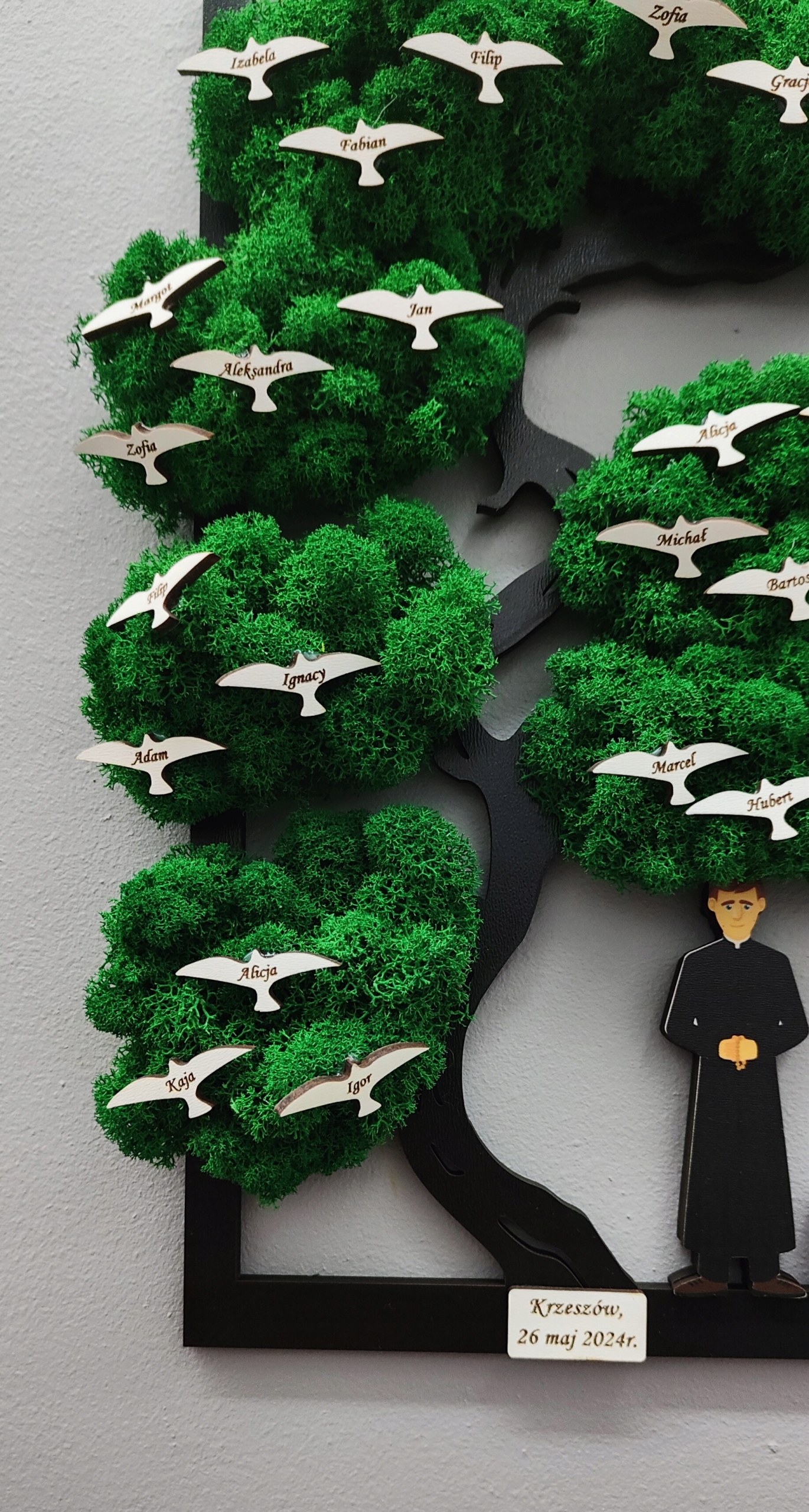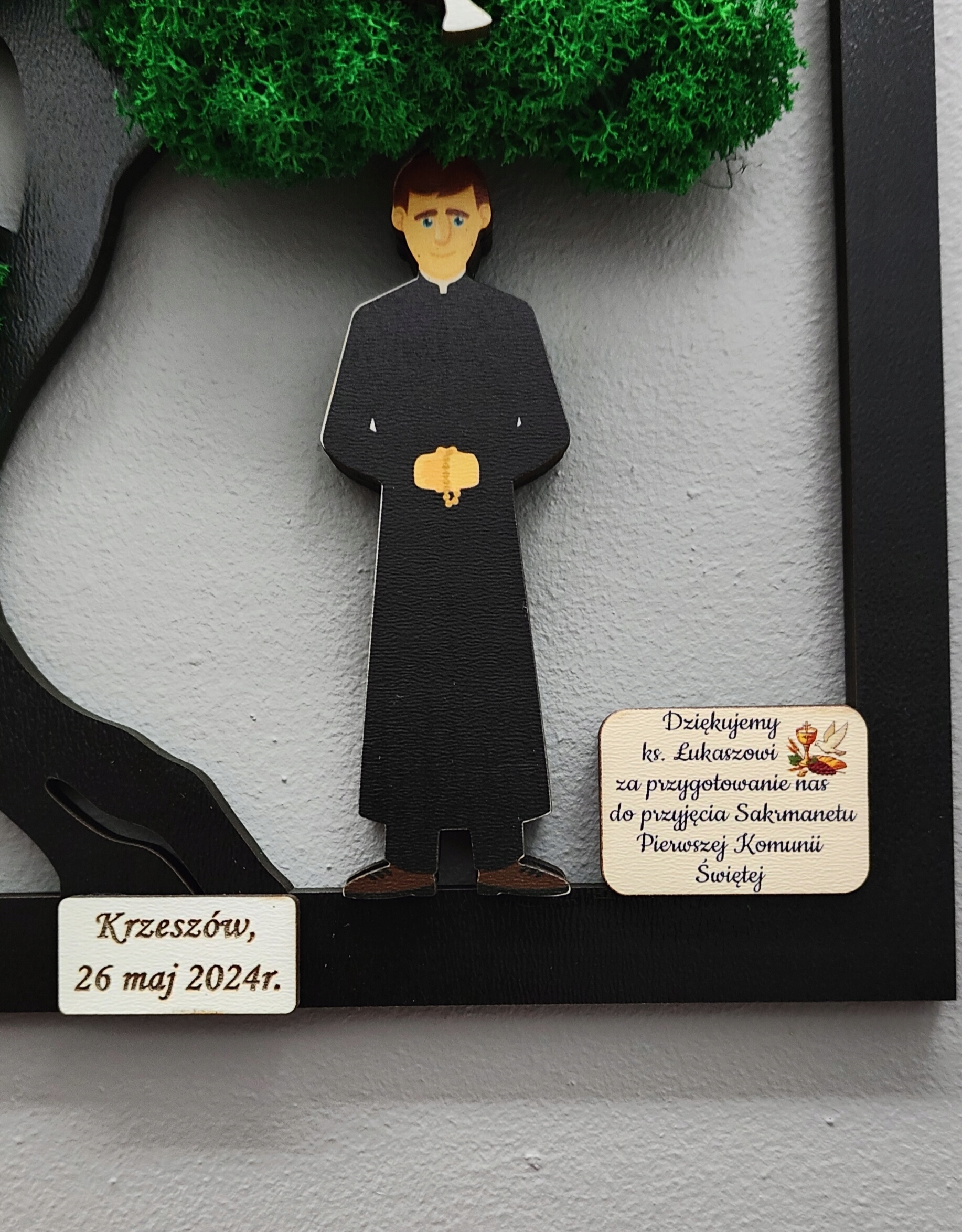 Дерево має символічну барвисту фігуру, включену в нього священика. Додатково рамка прикрашена 2 пластинами - одна кольорова, з УФ-принтом, гравіюванням. Гравіювання на пластинах можна вільно змінювати.