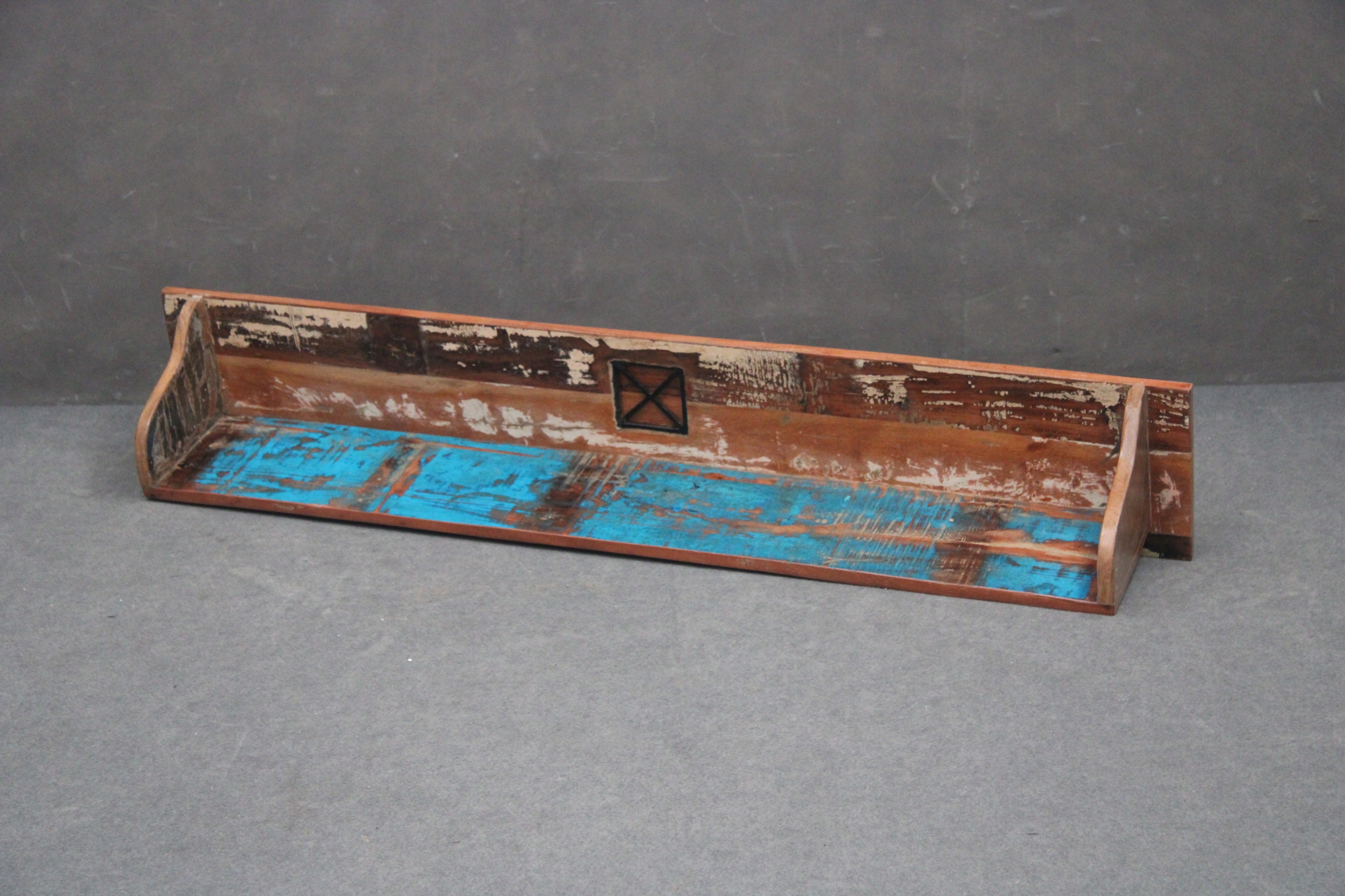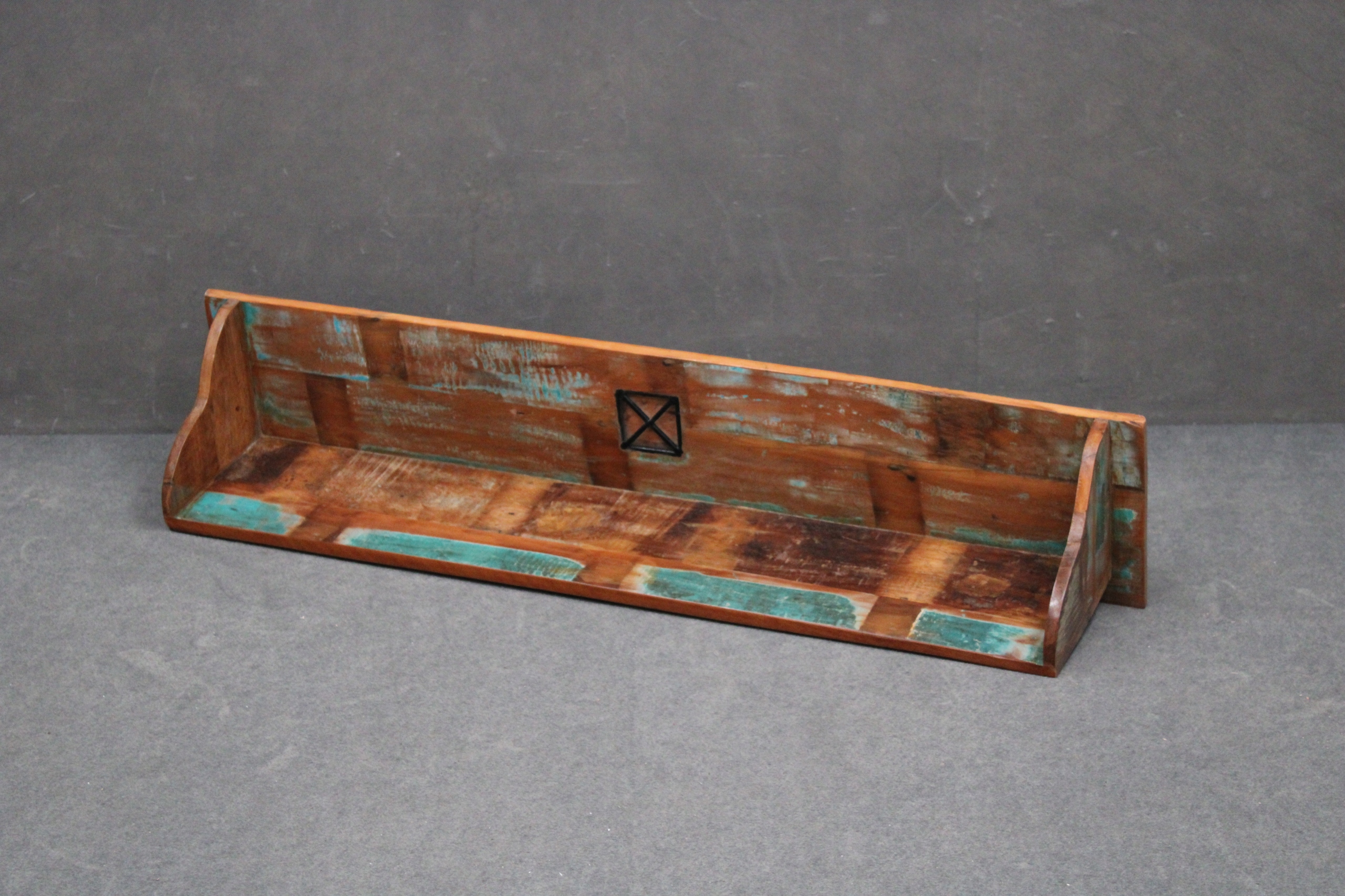 Полиця нова. Серія повністю виготовлена вручну з індійської переробленої деревини. Основною деревиною, яка використовується, є акація та манго. Завдяки унікальній фактурі деревини і різноманітності кольорів впишеться в будь-який інтер'єр і ідеально підійде для залу. Кольори, металева обробка та структура деревини (дрібні тріщини, дірки, нерівності, зроблені спеціально) підкреслюють індивідуальність меблів.