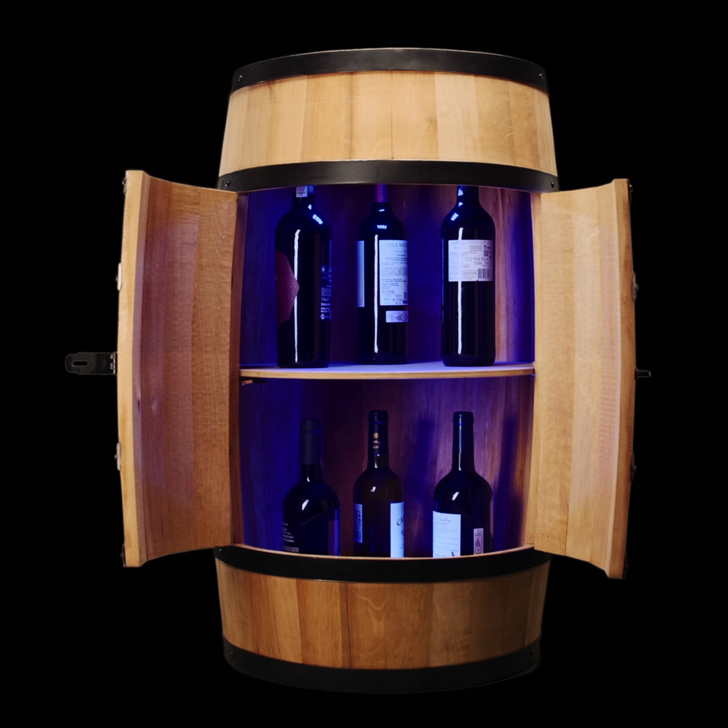 Стильний міні-бар з дерев'яної бочки з дверцятами, ексклюзивний і практичний предмет меблів для дому та бізнесу. Варіант із 7-кольоровим світлодіодним підсвічуванням RGB, керованим дистанційним керуванням.
