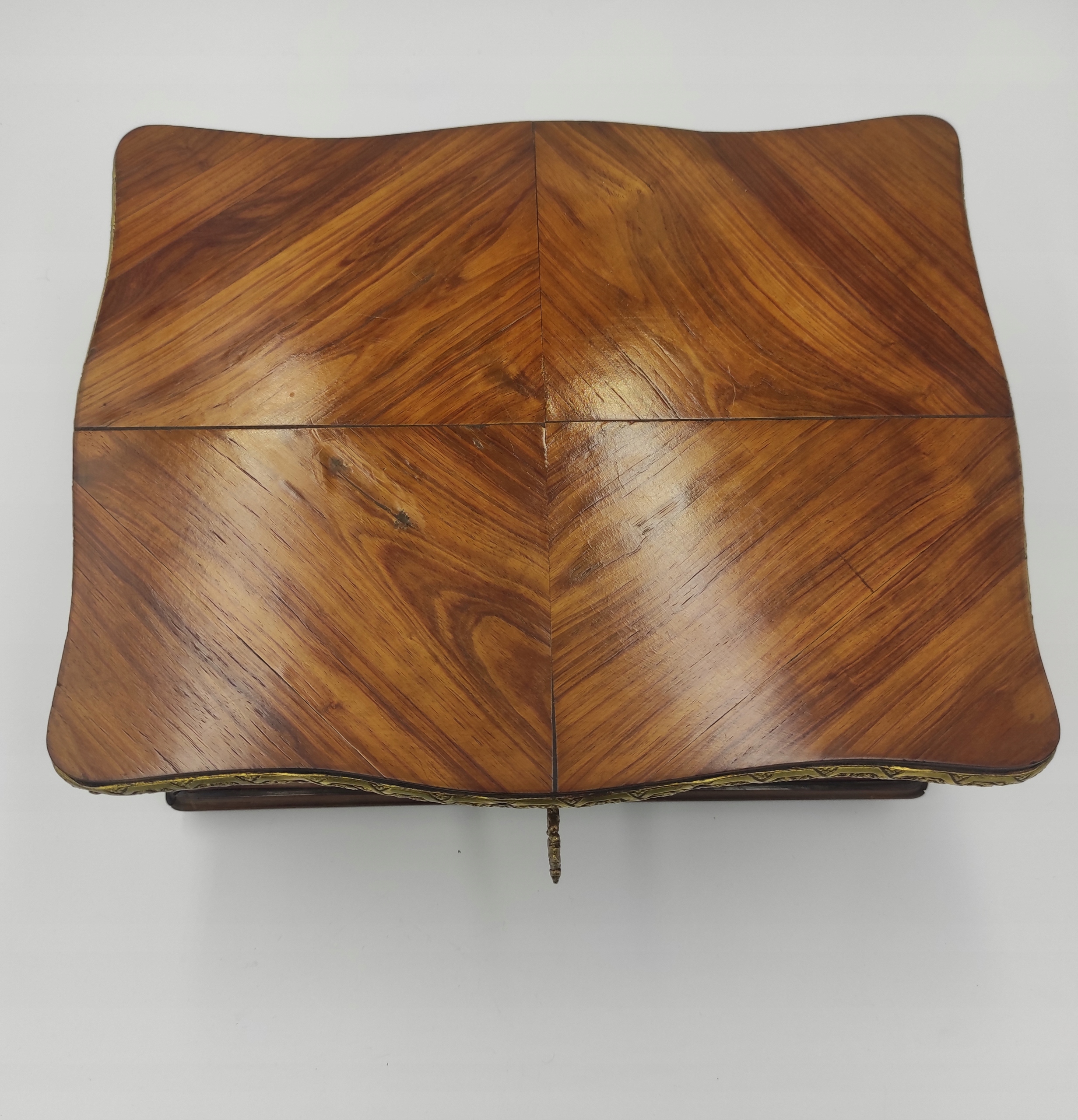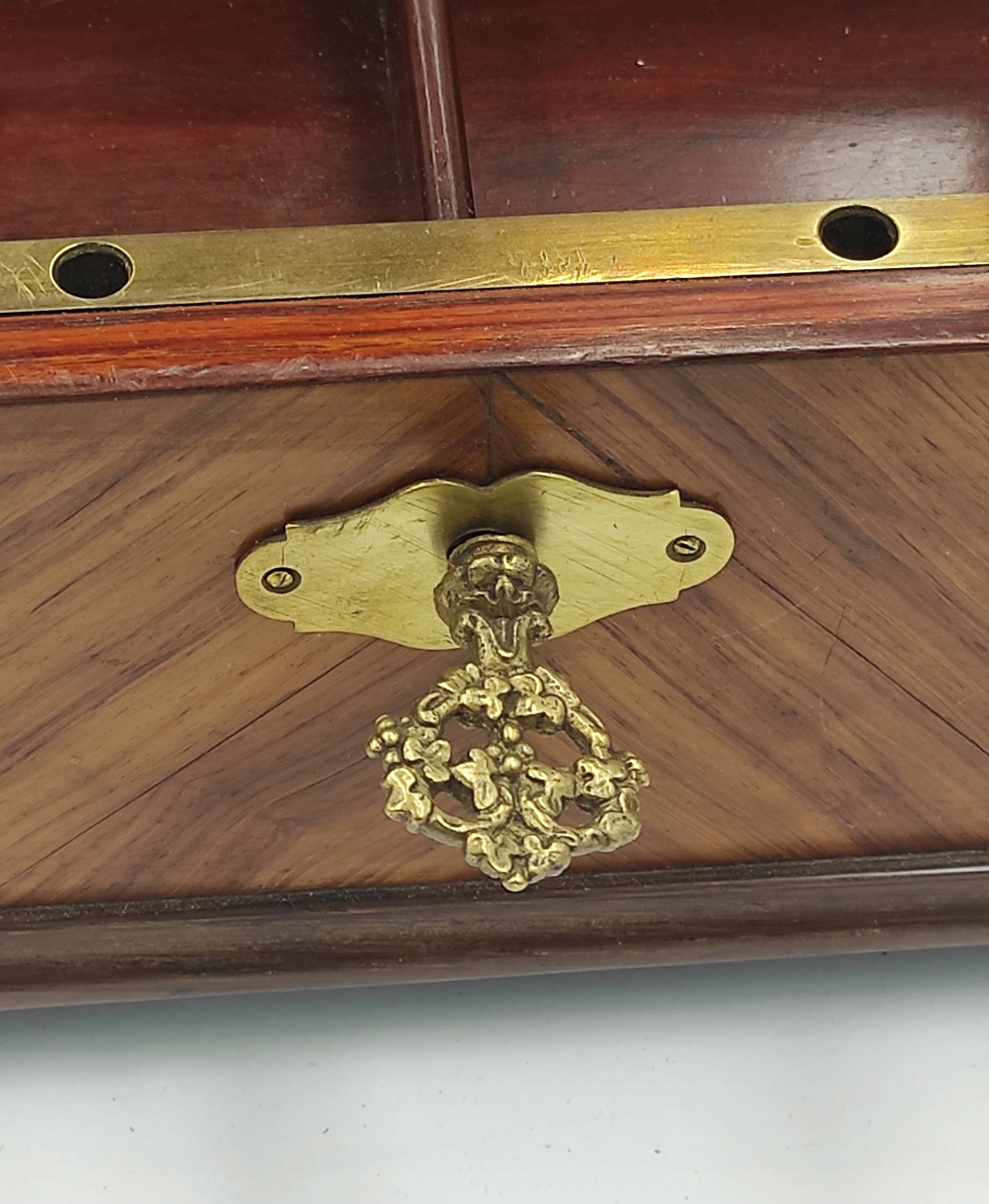 Він виготовлений із елегантного рожевого дерева з ромбовидним візерунком і оздоблений латунним обідком.