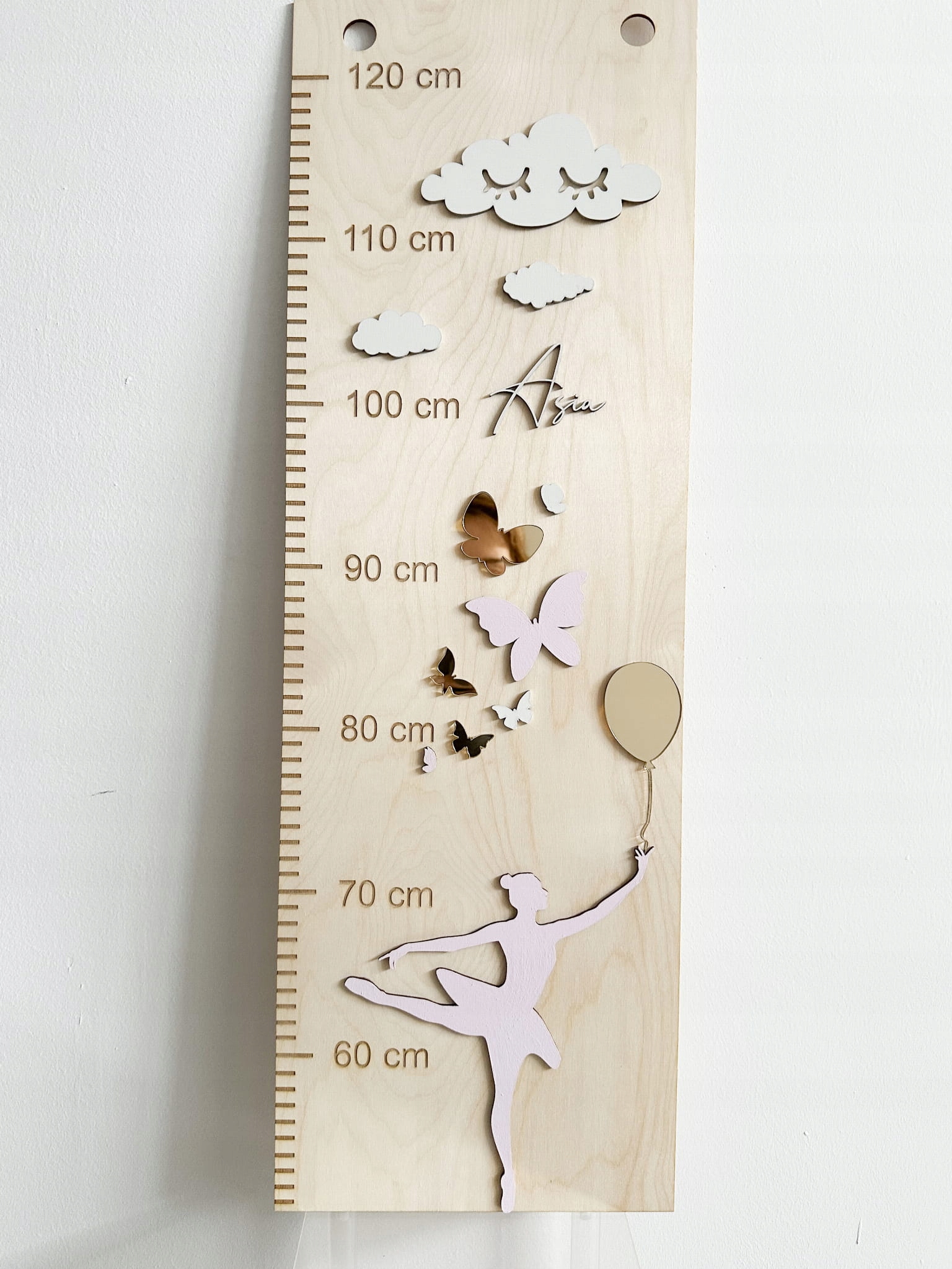Дерев'яна таблиця зросту з мотивом танцюючої балерини, гарне доповнення до дитяча кімната для всіх маленьких принцес. Таблиця зросту є чудовим сувеніром на довгі роки. Хіба ви не пам’ятаєте з любов’ю дверні рами з позначками зростання та віку у вашому сімейному домі?