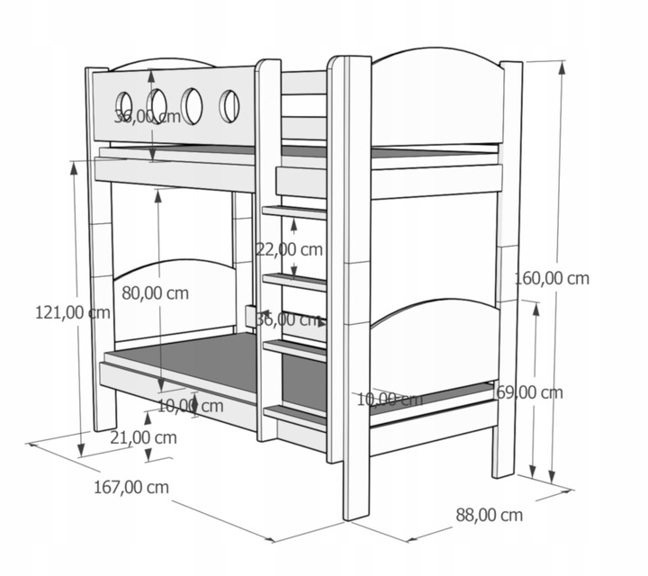 URWISEK L - двоярусне ліжко, яке можна розділити на два окремих ліжка. Виготовлена з високоякісної деревини сосни в поєднанні з міцною меблевою дошкою в підголовниках і верхніх рейлінгах. Драбина кріпиться праворуч або ліворуч від ліжка і має плоскі зручні сходинки, а краї дерев’яної конструкції мають округлі форми. Характерною рисою цієї моделі є гладкі дугоподібні підголівники та бічна верхня планка, прикрашена вирізаними колами.