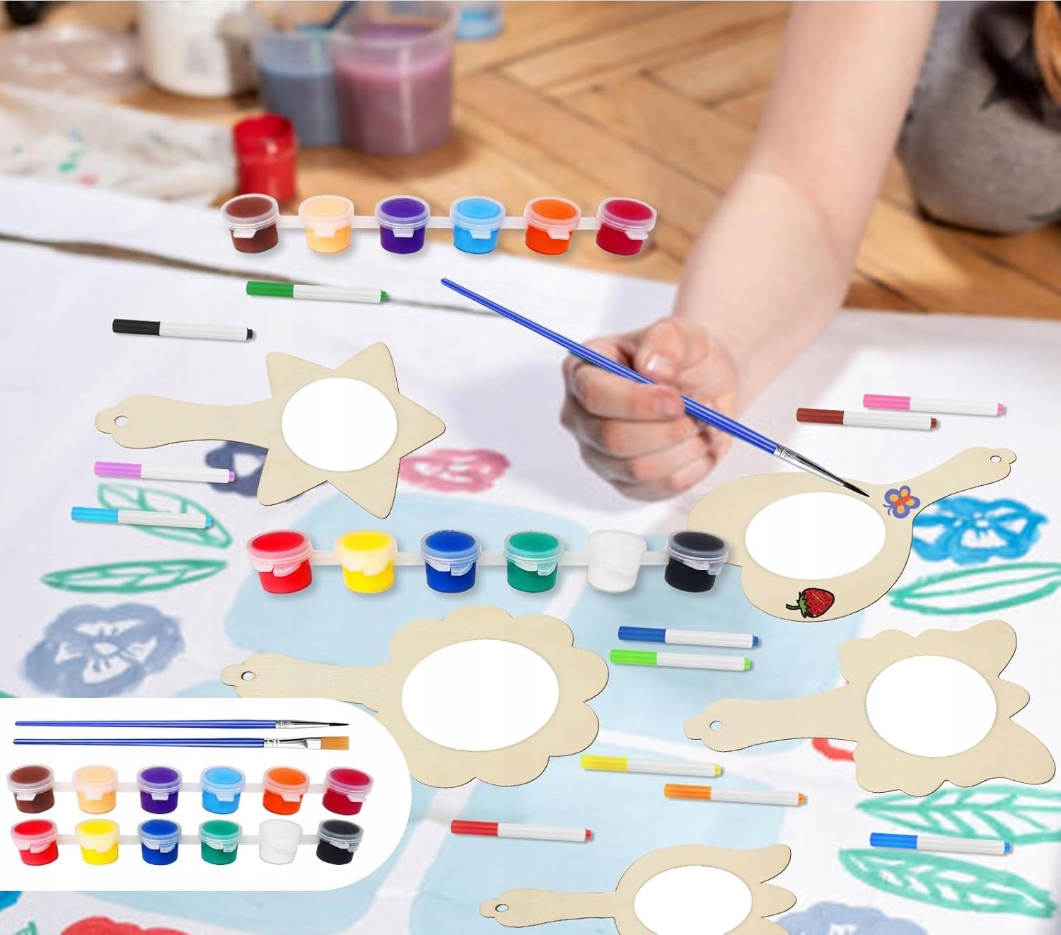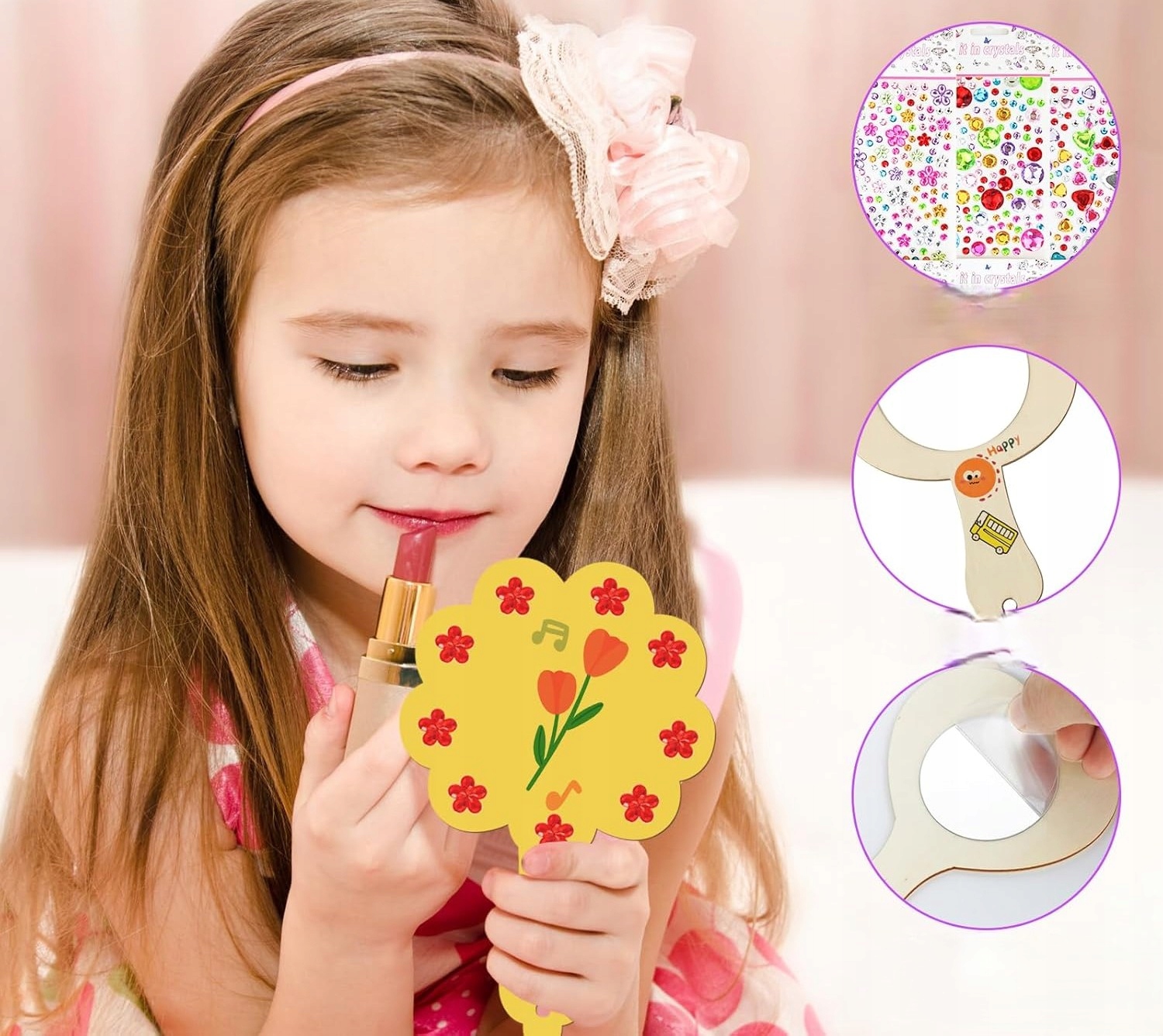 Дзеркальний набір для дівчат містить 4 фігури. Дзеркало у формі зірки, серця, квітки та тюльпана. Включає фарбу та наклейки, які забезпечують різні кольорові відчуття, за допомогою яких діти можуть створити власне дерев’яне дзеркало в улюбленому кольорі та тіні.