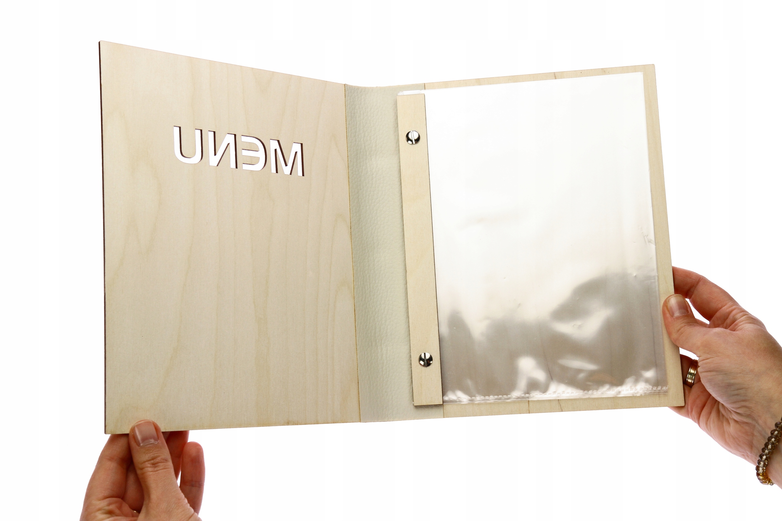 Обкладинка меню виготовлена з фанери товщиною 3 мм. Обкладинки шліфовані, без потворних лазерних живців та лазерної гравюри.