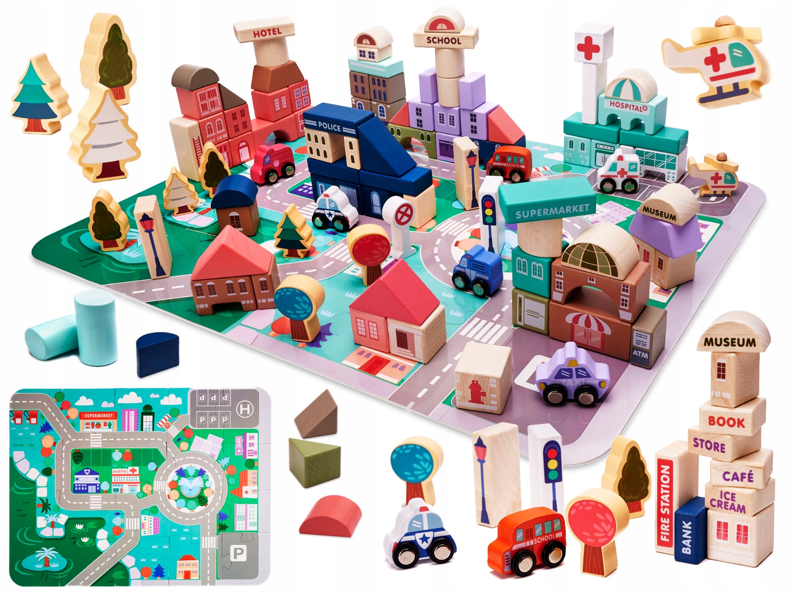 w Місто не може пропустити найважливіші - вулиці та машини . Набір включає головоломку з вуличною смугою, яка доповнить ціле. Набір різнокольорових блоків -це творча, розробка пропозиції Весело