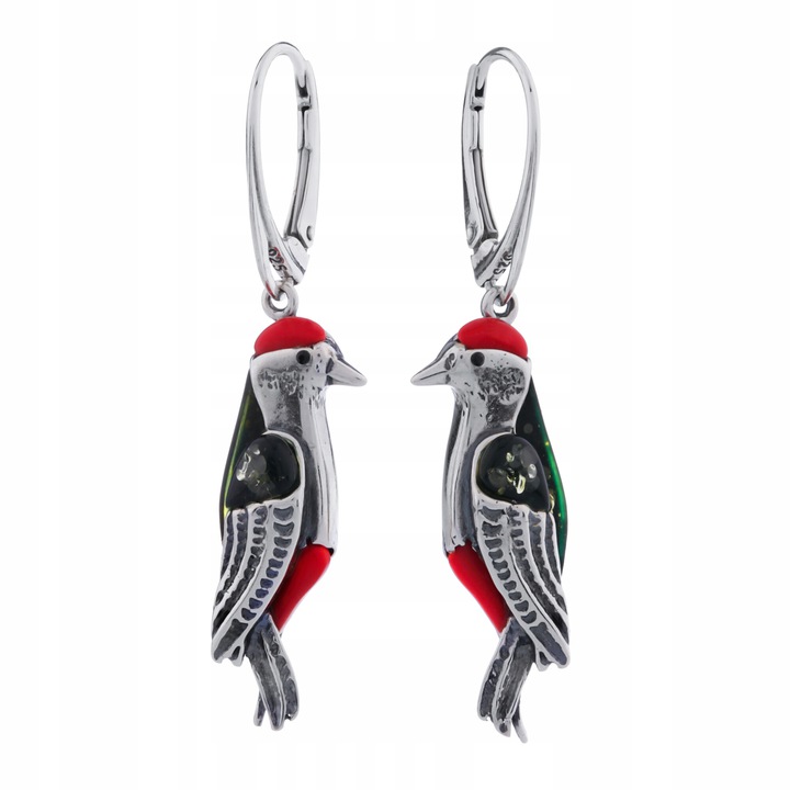 SILVER WOODPERK EARRINGS із ЗЕЛЕНИМ БУРШТИНОМ і ЧЕРВОНИМ КОРАЛОМ