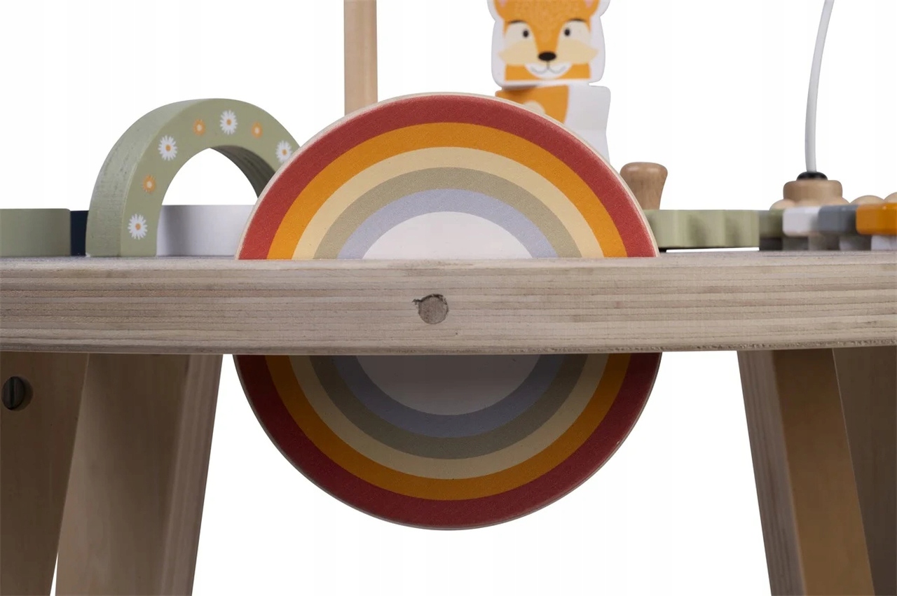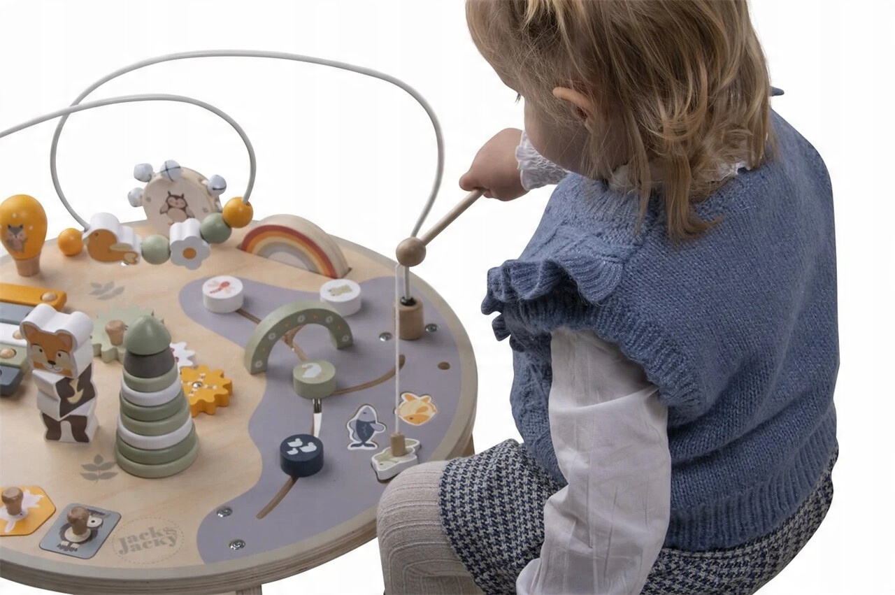 Забезпечте дитині радісну та розвиваючу гру завдяки дерев’яному навчальному столу Джека та Джекі! Ця барвиста таблиця, повна інтерактивних елементів, підтримує рухову розробку та творчість малюка. Тварини, риболовля, переміщення елементів і грають зі спіральною намистинами.