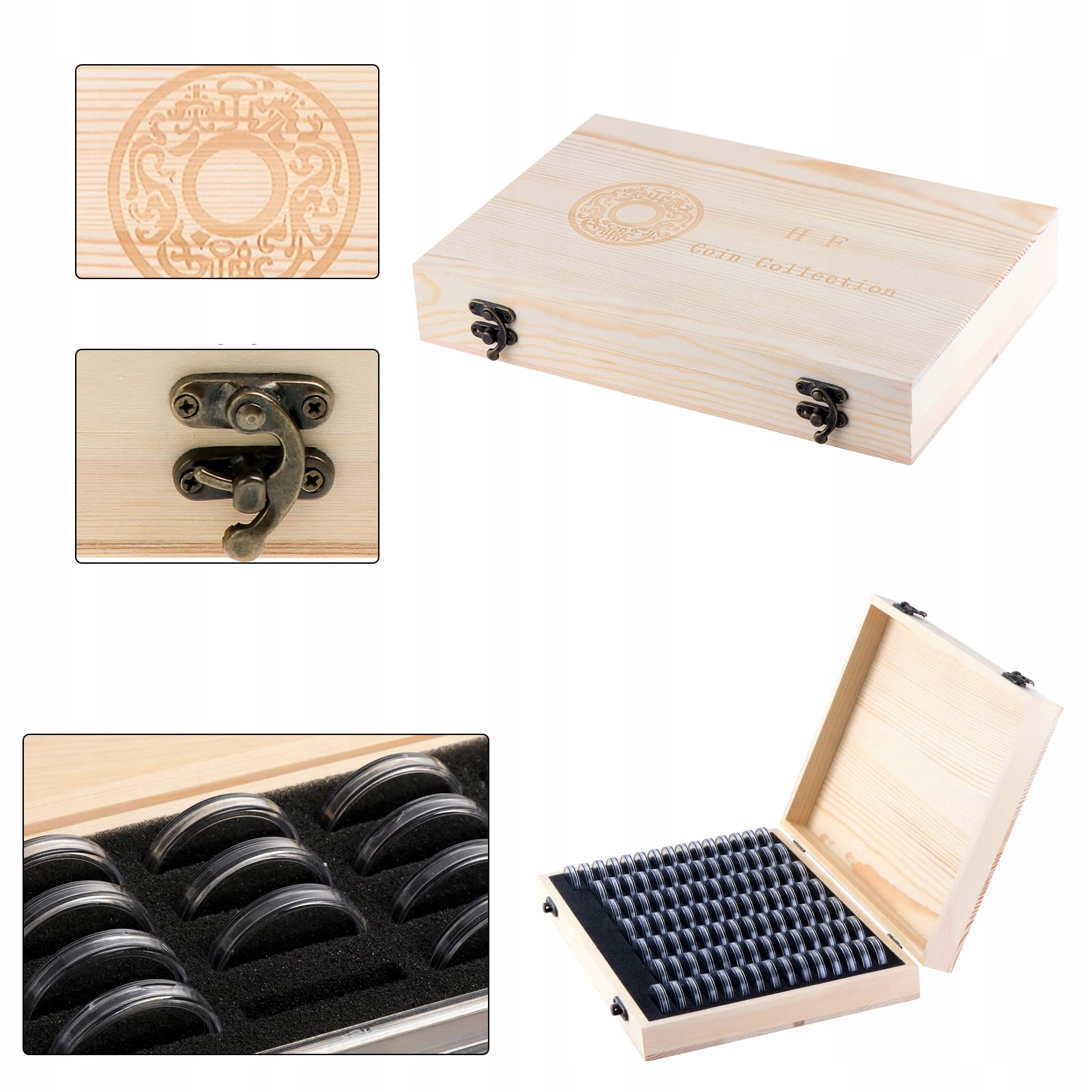 - ✔️ 【Дерев’яний ящик для зберігання монет】: ящик для зберігання монет виготовлено з високоякісної соснової деревини з має поліровану поверхню та має приблизно 280 x 190 x 45 мм. Вміщує 100 пластикових капсул для монет, практична та міцна, ідеальна для збору монет різного розміру.