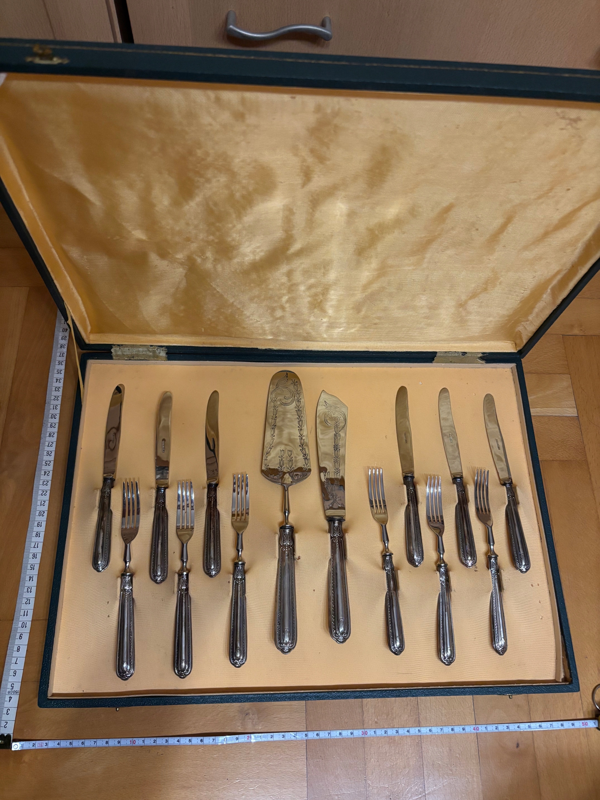 Deserowy komplet sztućców w pudełku trzonki srebro 800 6 widelce 6 noże + 2