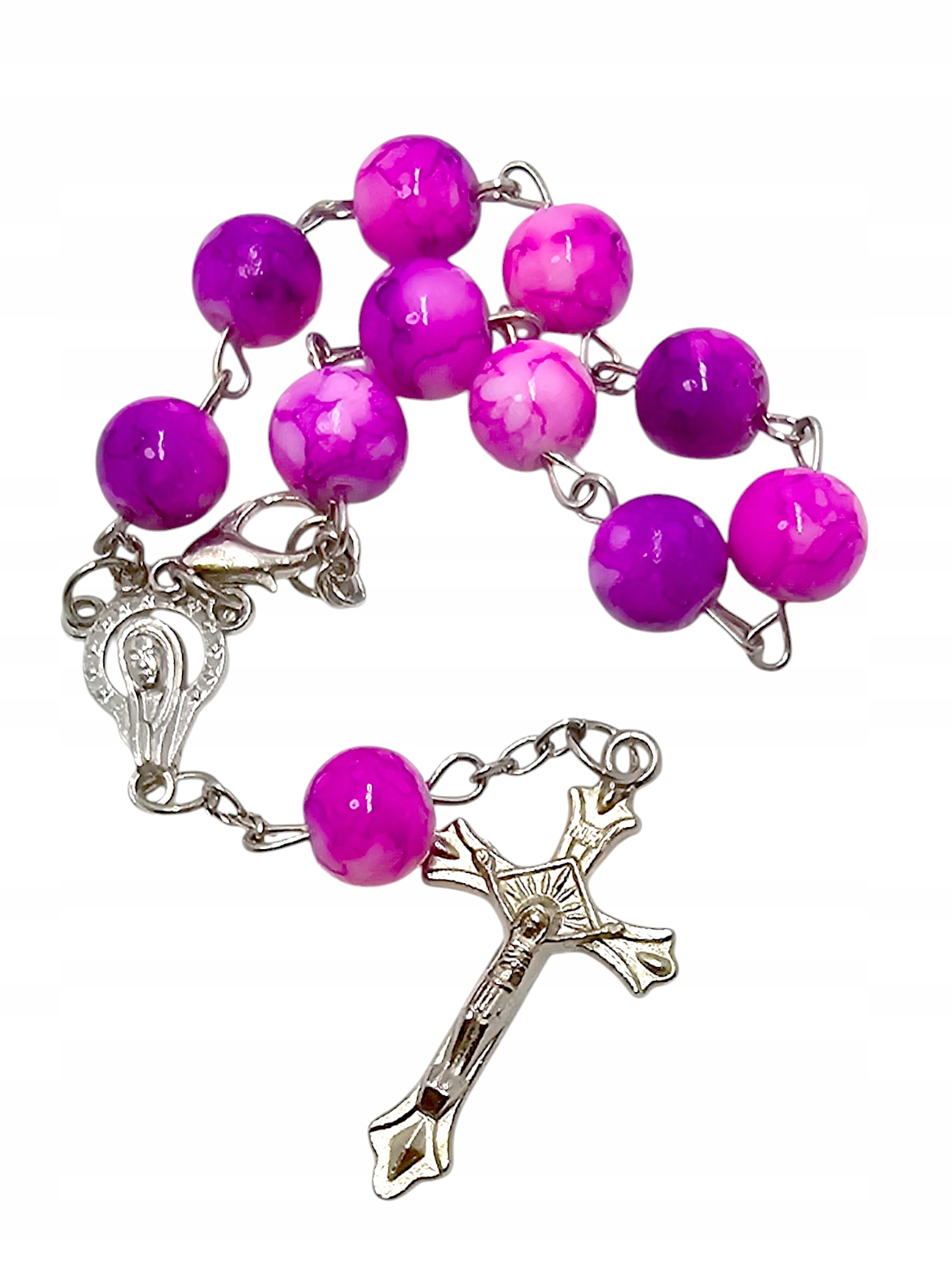 Елегантний десять розарію, виготовлених з красивих рожевих скляних намистин з діаметром 8 мм, імітуючи натуральний камінь. Ця стильна десять кріпиться, що дозволяє зручно носити або зважити, наприклад, у машині. Розарний роз'єм - це делікатна форма Марії, а цілий увінчаний декоративним металевим хрестом з розмірами 32x17 мм. Це тонке і сповнене духовного значення аксесуара, ідеально підходить для щоденної молитви та як вираження віри.