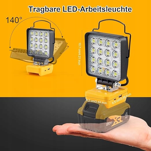 Світлодіодна робоча лампа з кутом 120-140 ° та світлодіодна лінза, що охоплює більшу область освітлення. Регульована яскравість на двох рівнях допомагає заощадити енергію. Ця робоча лампа сумісна з батареями Dewalt 20 V, такими як DCB206, DCB205, DCB204, DCB181, DCB182, DCB200, DCB203, DCB205-2, DCB204-2, DCB206-2 тощо. Акумулятор: Поки ви носите акумулятор, бездротовий світлодіодний світильник простий у використанні зовні без джерела живлення і випускає вас із заплутаної та обмеженої кількості розетків. Крім того, бездротова акумуляторна лампа має вихідні порти USB та Type-C, які підтримують одночасну зарядку двох пристроїв, таких як мобільні телефони, планшети, гравці MP4, цифрові камери тощо.