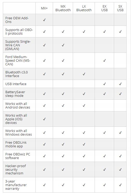 абревіатура MX + (Android/iOS/Windows + доповнення для вибраних брендів) з іншими моделями ObdLink.