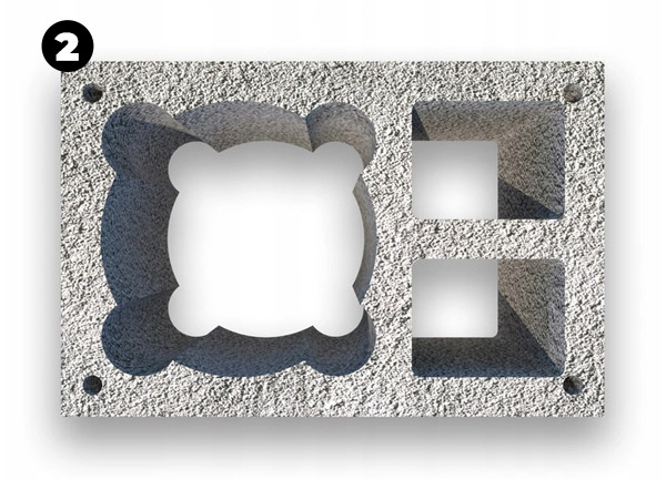 (2) БЛОКИ БЕТОННІ LECA відрізняються високою довговічністю, вогне- та морозостійкістю. Кожен блок має систему каналів для вентиляції керамічної вставки та вати в димоході, а також отвори для додаткового посилення, якщо це рекомендовано через висоту над дахом. Для цього можна використовувати ребристі стрижні з максимальним діаметром 12 мм або різьбові кручені стрижні 8 мм, а потім залити тонким бетоном. Висота кожного блоку становить 33 см і дорівнює висоті керамічної труби Для спорудження 1 метра димоходу використовуються 3 частини, з’єднані цементно-вапняним розчином без необхідності використання вис. шви, як у випадку з блоками висотою 24 см, що полегшує кладку і монтаж. Перевага блоків висотою 33 см полягає в рівномірності зрізів. Усі блоки відповідають стандарту EN12446.