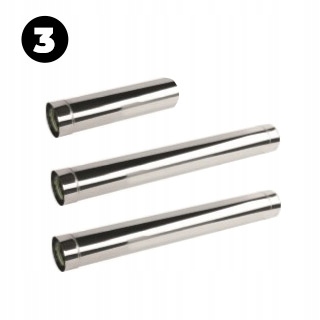 (3) ПРЯМІ ТРУБИ для відведення вихлопних газів, Ø 80 мм у діаметрі та довжиною 1000 мм та 500 мм, залежно від висоти димоходу.