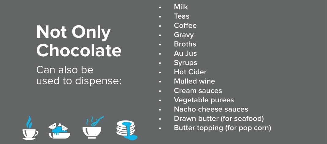 Необмежені можливості Також можна використовувати для дозування: шоколаду, молока, сидр, глінтвейн, чай, кава, глазур, сиропи, масло (для попкорну), соуси, бульйони, пюре та інші гарячі напої.
