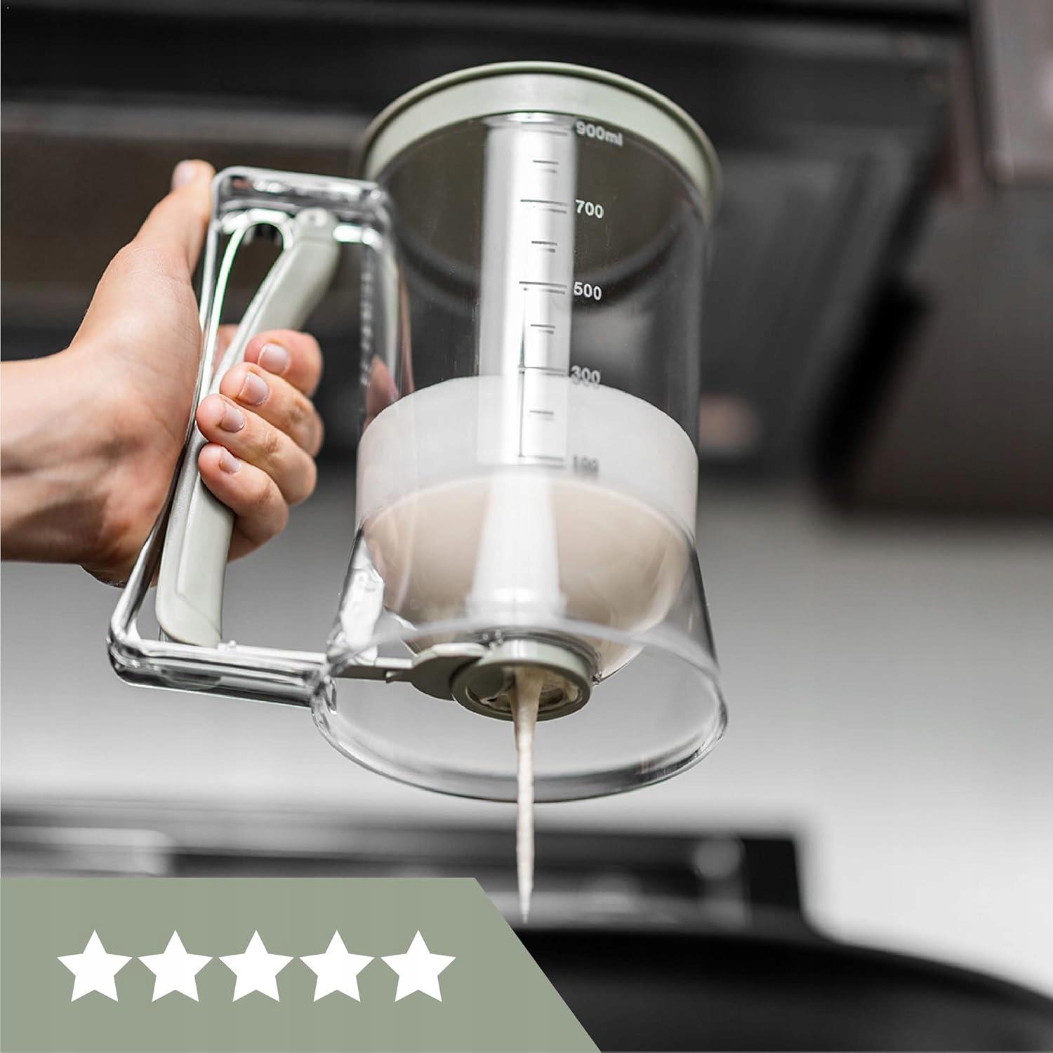 Ідеальні млинці та млинці всередині ваших рук! Ідеальні пропорції, без безладу і з абсолютною точністю - цей дозатор стане вашим незамінним помічником на кухні. Підготовка чудових млинців, млинців або вафель ніколи не була такою простою! ! Наш дозатор оснащений трьома вимірювальними шкалами, які гарантують точне вимірювання як сухих, так і рідких інгредієнтів. 4 Якісний пластик, Диспензатор не тільки довговічний, але й естетичний. Його прозорий контейнер дозволяє керувати кількістю тіста, а кришка сірого або зеленого (поєднання кольорів) надає йому сучасний вигляд. Більше того, це легко очистити - просто киньте його в посудомийну машину! Широка ручка і точний важіль, дозування тіста однією рукою ніколи не було простіше! Це усуває безлад і робить кожну порцію ідеальною. ✔ три Вимірювання шкал - Точне вимірювання як сухих, так і рідких інгредієнтів.