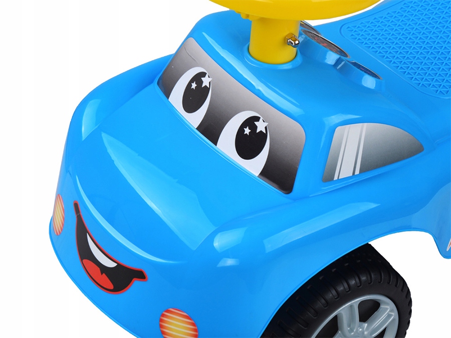 Набір складається з пластикового корпусу автомобіля, коліс, обертового, акустичного керма. кермо, спинка, задня опора, вісь і декоративні ковпаки. Продукт призначений для дітей старше 12 місяців - його можна використовувати всім малюкам, вага яких не перевищує 20 кг. Продукт сертифікований CE, а для його виробництва використовувалися безпечні для дітей матеріали.
