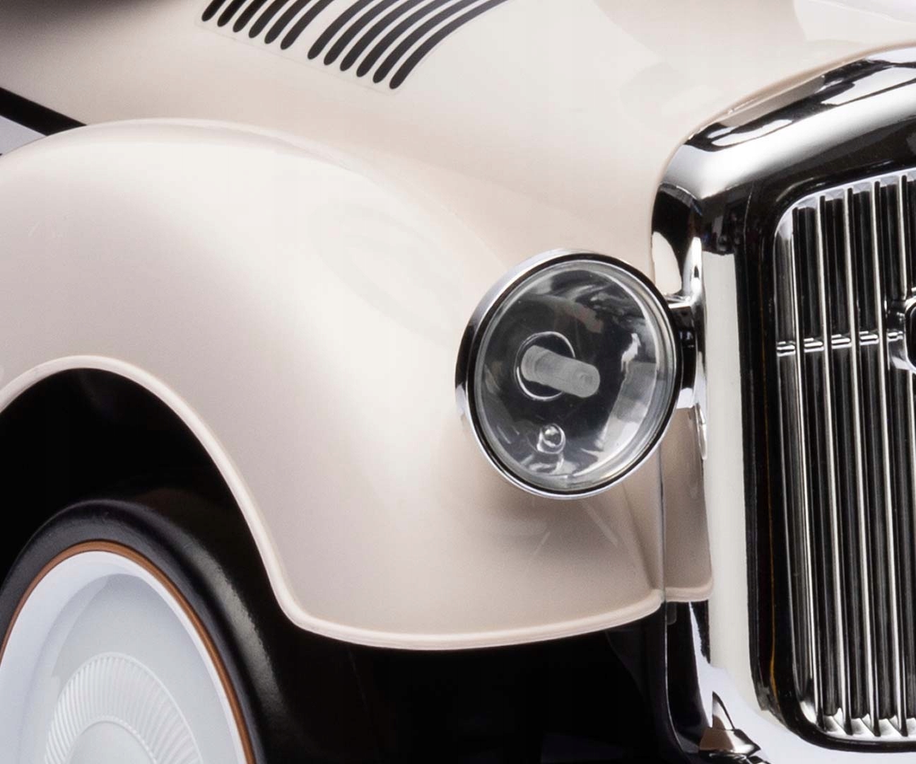 ретро-автомобіль може використовуватися як перший транспортний засіб із справжнім кермом і рогом, також як штовхач із відкриттям для іграшок (невеликий багажник), на задній частині транспортного засобу, розміщеного з імітацією вливання палива, а передня частина автомобіля- срібло.