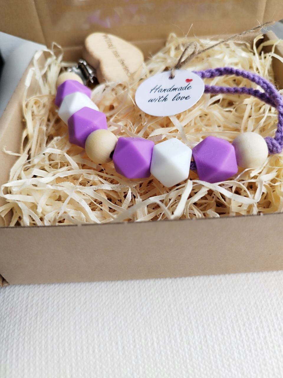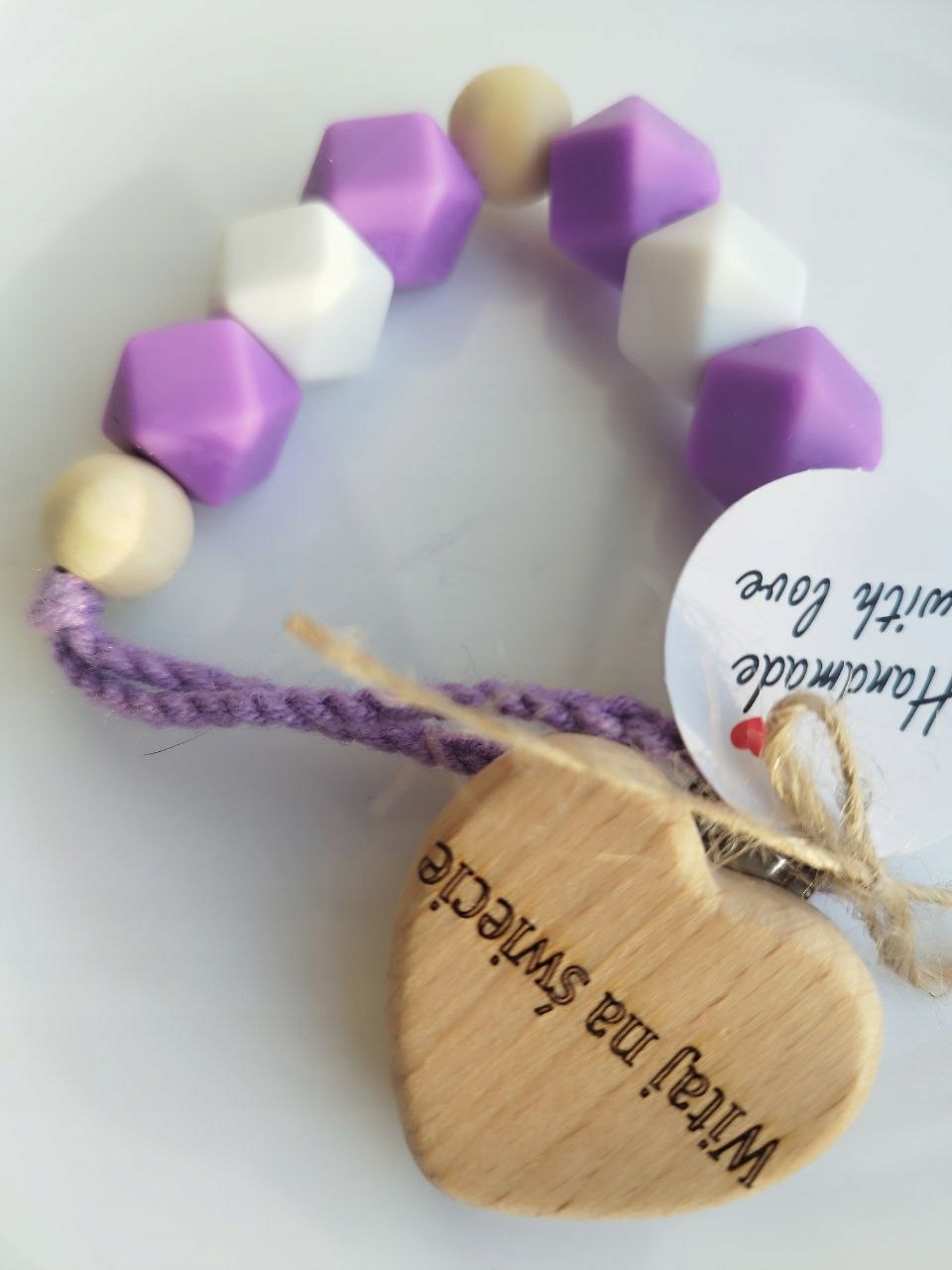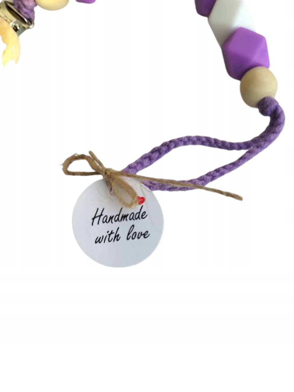 Предметом аукціону є персоналізована підвіска-пустушка або прорізувач. Підвіска з дерева та силікону. Шнурок пов'язаний гачком вручну. Це ручна робота, тому вона зроблена з обережністю.