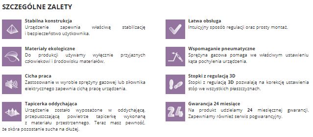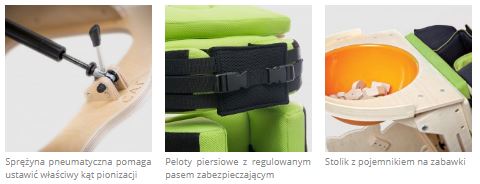 Можливість легкої та плавної зміни кута нахилу (від 25° до 85°) навіть з дитиною в пристрої. Розгалужена система пелотів і ременів безпеки дозволяє дитині почуватися дуже впевнено та безпечно в CAT I.