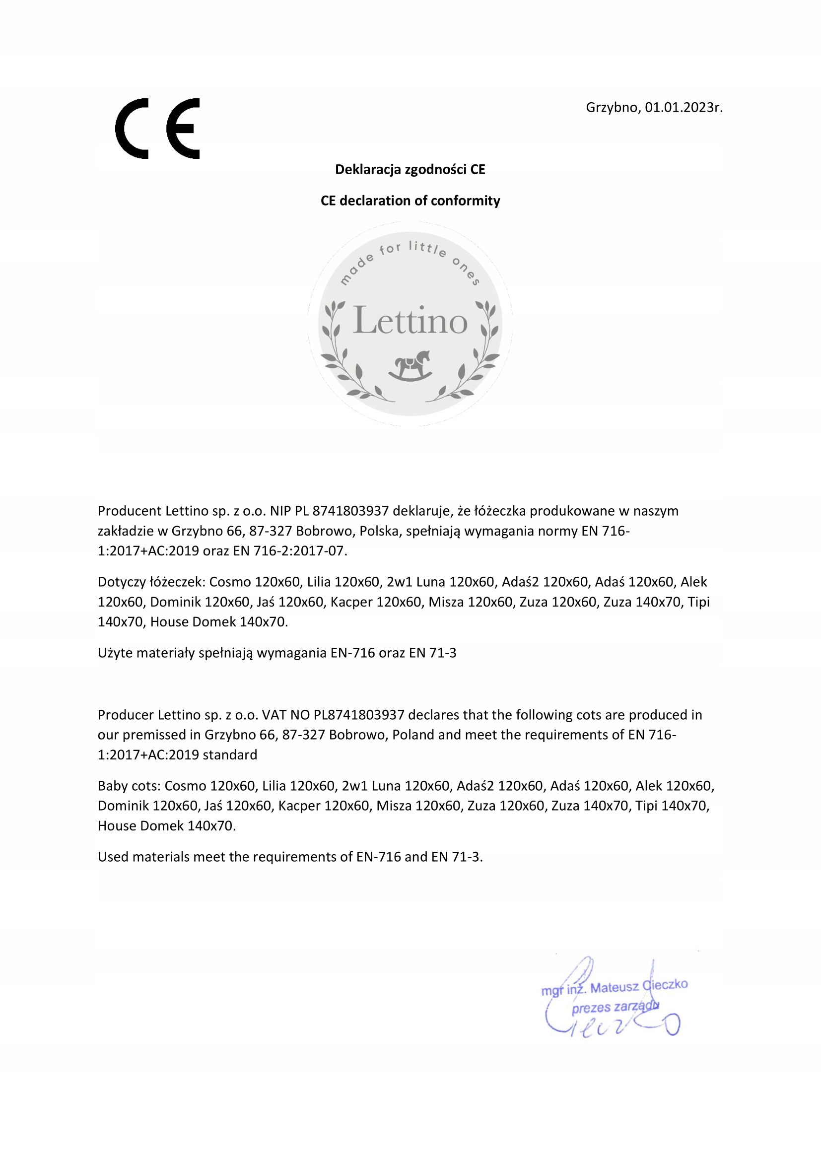 Будівництво дитячого ліжечка Cosmo відповідає застосовним стандартам безпеки та стабільності ЄС.