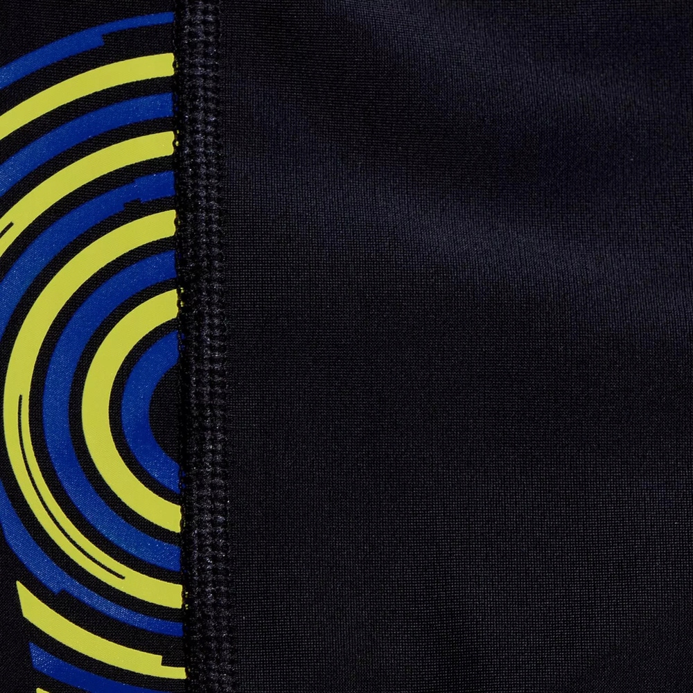 Ці чорні аквашорти з жовтою та синьою графікою пластизолу є стильними та стриманими.