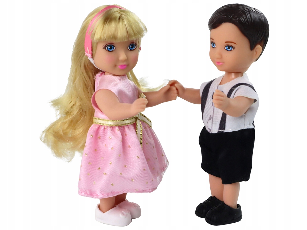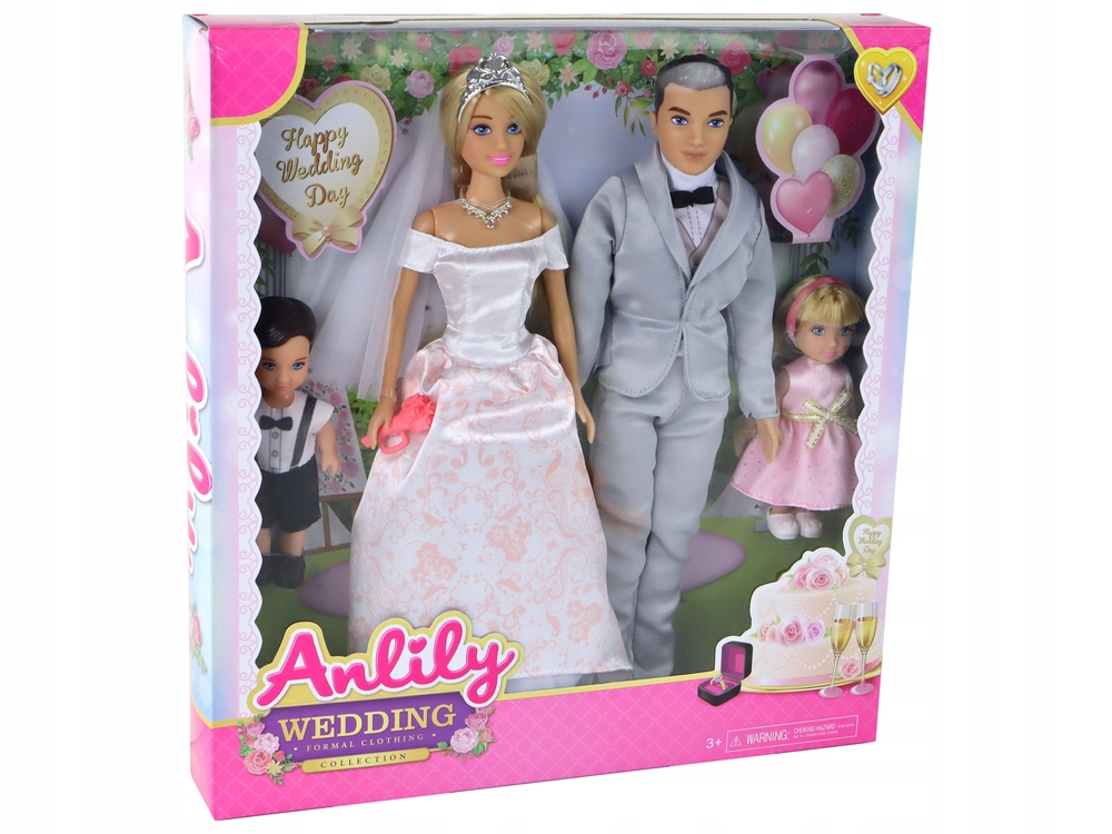 Хлопчик одягнений у елегантний костюм і взутий у чорні туфлі. Дівчина одягнена в рожеву сукню і білі туфлі. Вони обоє мають щасливі обличчя, і вони заохочують їх грати як сім'я. Лялька-наречена має розміри 30 см х 8 см х 4 см, як і наречений. Розміри дітей 12 см х 4 см х 3 см.✨