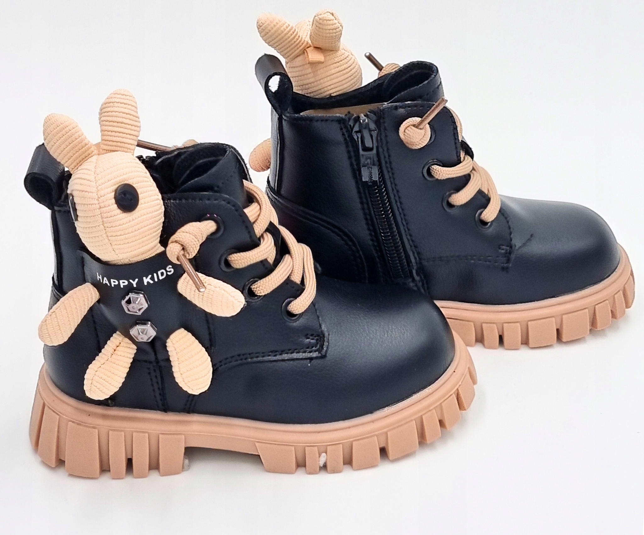 чорного кольору з бежевою підошвою та декоративним зайчиком. Високі ботильйони з екологічної шкіри, що гарантує довговічність виробу. Туфлі для дівчаток мають товсту гумову підошву з протектором, що захищає від ковзання, а фіолетовий колір урізноманітнює класичну чорну колірну гамму. Зимове взуття має м'яку овчину всередині, яка гарантує тепло навіть у холодні дні. Застібка-блискавка збоку полегшує надягання та знімання взуття, а шнурки забезпечують ідеальну посадку. Крім того, зимове взуття має м'яку устілку з овчини, що підвищує комфорт використання. Декоративного ведмедика можна витягнути і використовувати як іграшку. Перехідне взуття, ідеальне для повсякденного використання в холодні дні, добре підійде восени та взимку. Взуття з ведмедиком виконано добротно, а їх цікавий дизайн та іграшка роблять продукт унікальним.