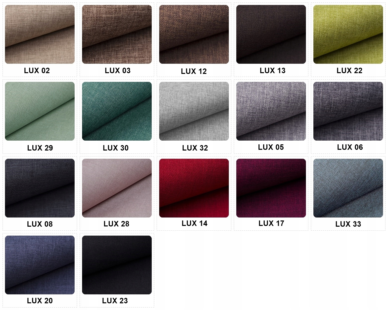 LUX(SAWANA)- дуже міцна, надзвичайно стійка до стирання та сколювання, і в той же час приємна на дотик ткана тканина з цікавою структурою та неоднорідним кольором, створена два відтінки ниток. Клеїться на поліестерову основу. Він доступний у дуже широкому діапазоні кольорів: від землистих кольорів та сірого, через інтенсивні відтінки фіолетового та червоного до ніжних пастельних. Він універсальний в плані облаштування. Ідеально підходить як оббивка для сучасного крісла, класичного дивана або елегантного крісла. Тканина також стійка до стирання протягом 100 000 циклів.
