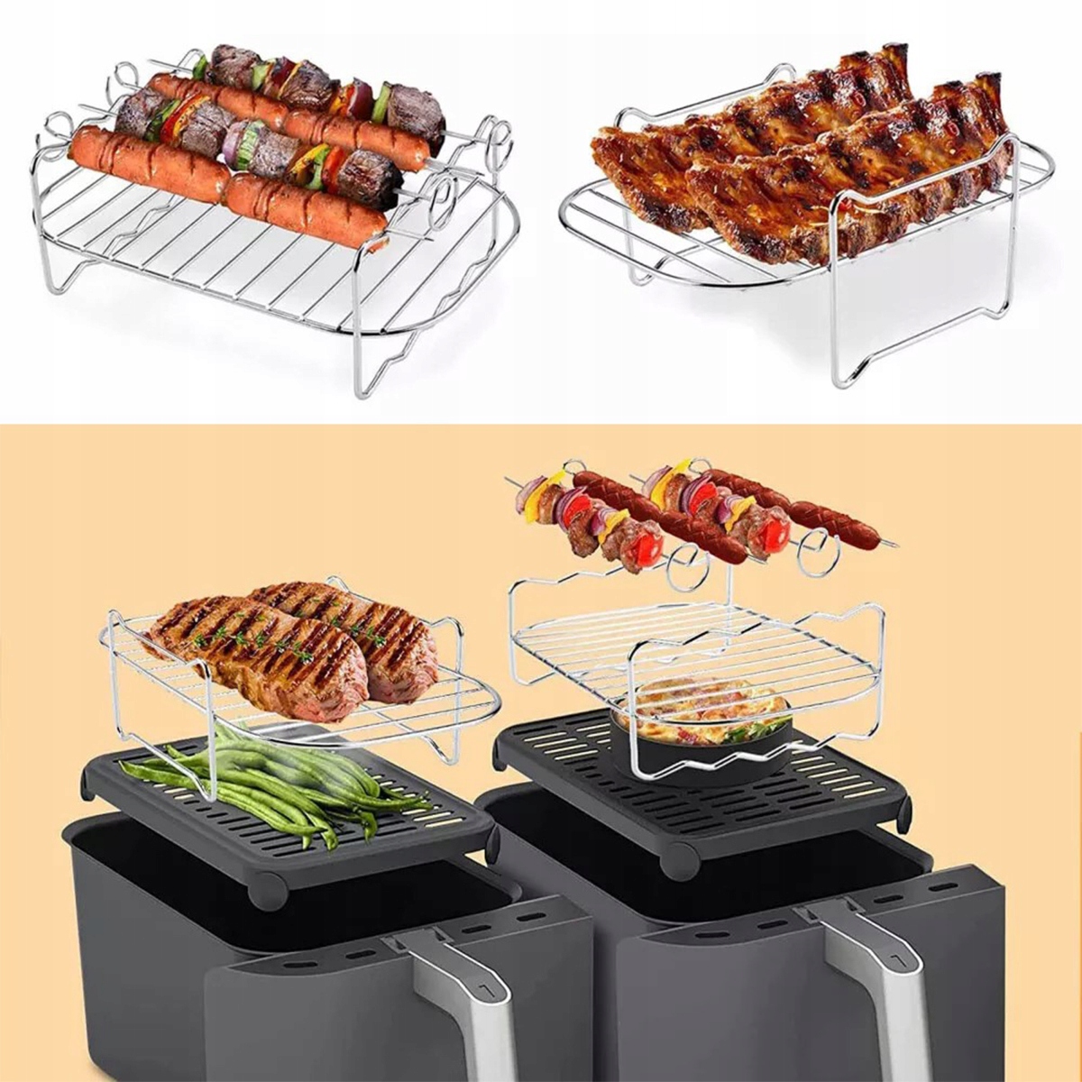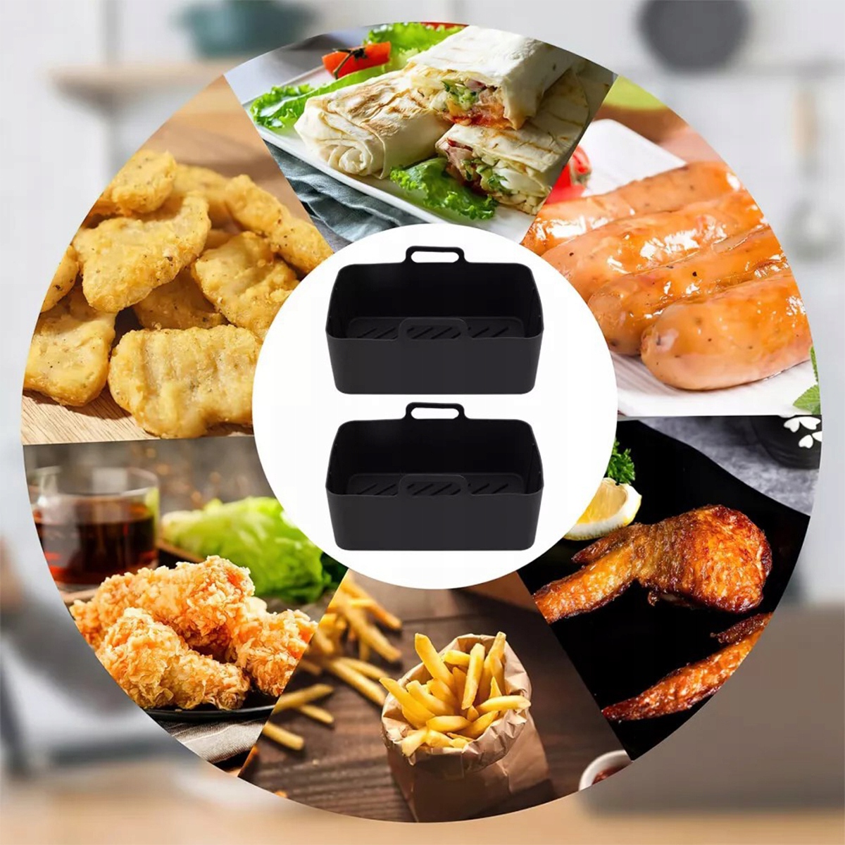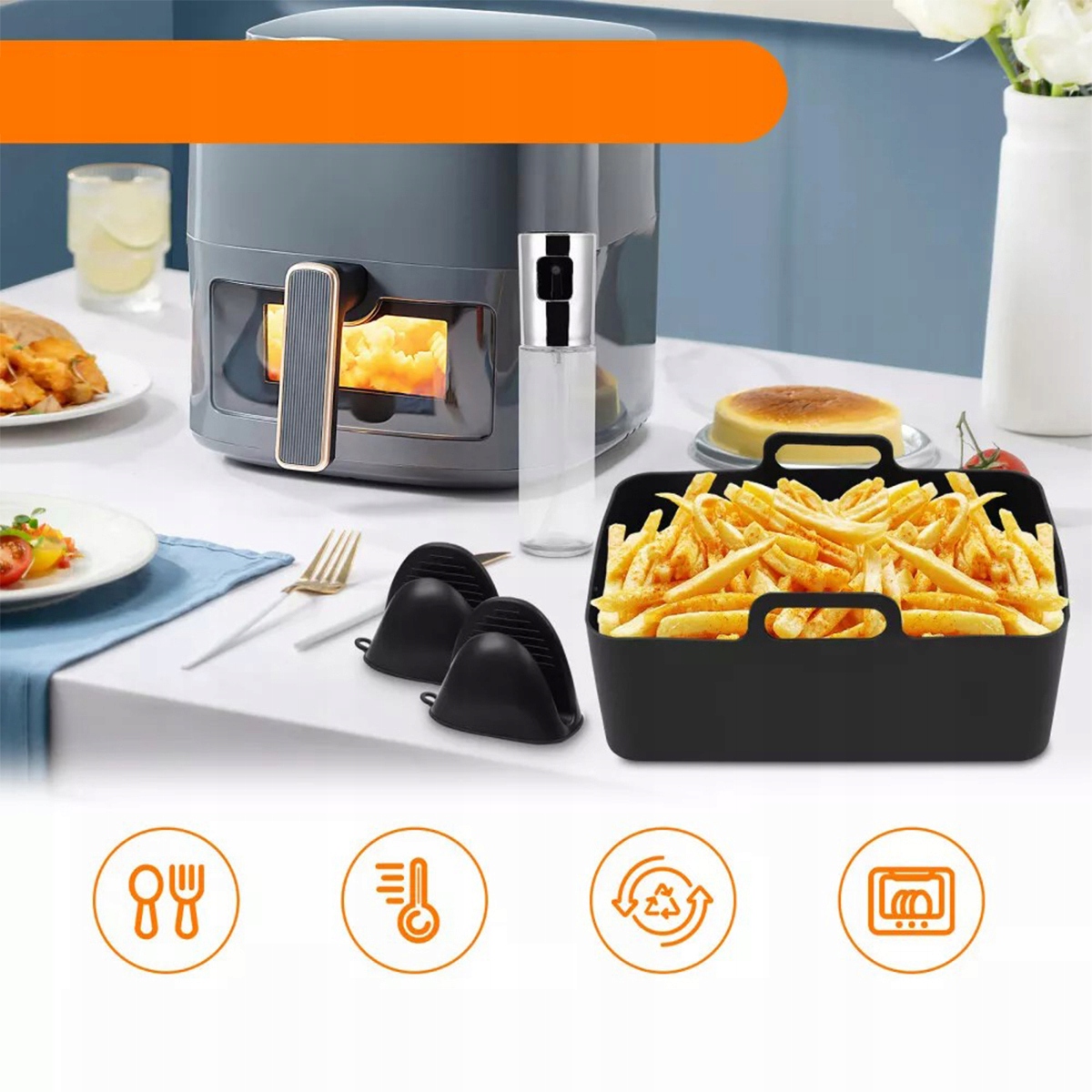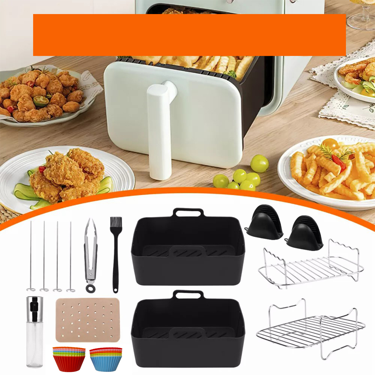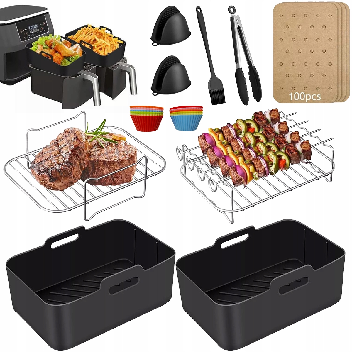 Improve your frying experience thanks to 2 silicone air -fried molds, 2 stainless steel grilled grilled grates, 12 mini cakes for cakes (2 in 6 colors), 100 oiling paper, 2 silicone gloves, 1 silicone gloves, 1 silicone gloves, 1 silicone gloves, 1 silicone Кисть рукавичок, 1 їжу та 1 розпилювач на олію потужністю 100 мл. Ця колекція пропонує все необхідне для приготування смачних та зручних страв.