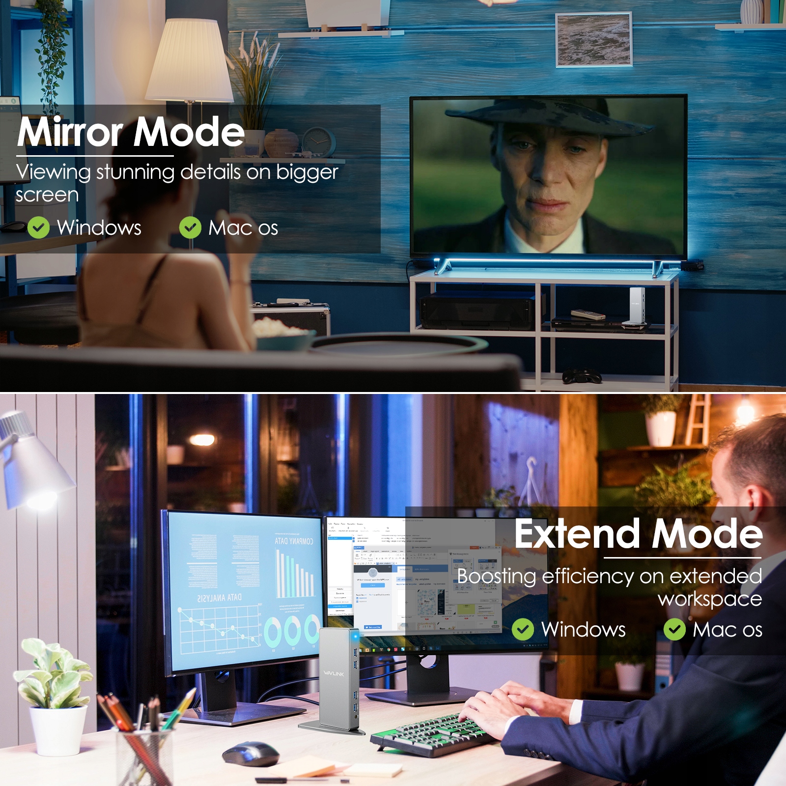 Док-станція WAVLINK 14-в-1 розкриває повний потенціал вашого ноутбук із 5K DISPLAY 1 (DP1+HDMI1), 5K DISPLAY 2 (DP2+HDMI2), 6 портами USB-A 3.0 5Gbps, портом Ethernet 1000Mbps, входом 20V DC PD і аудіороз’ємом 2 в 1 Примітка: у одна група відеопотоку (DISPLAY 1/2), порт DP і порт HDMI не можна використовувати одночасно. Якщо монітори мають порти HDMI і DP, підключені до DISPLAY 1/2 одночасно, порт DP матиме пріоритет. І Windows, і Mac підтримують розширений режим і дзеркальний режим, тому ви можете оцінити кожну деталь на одному або двох моніторах.