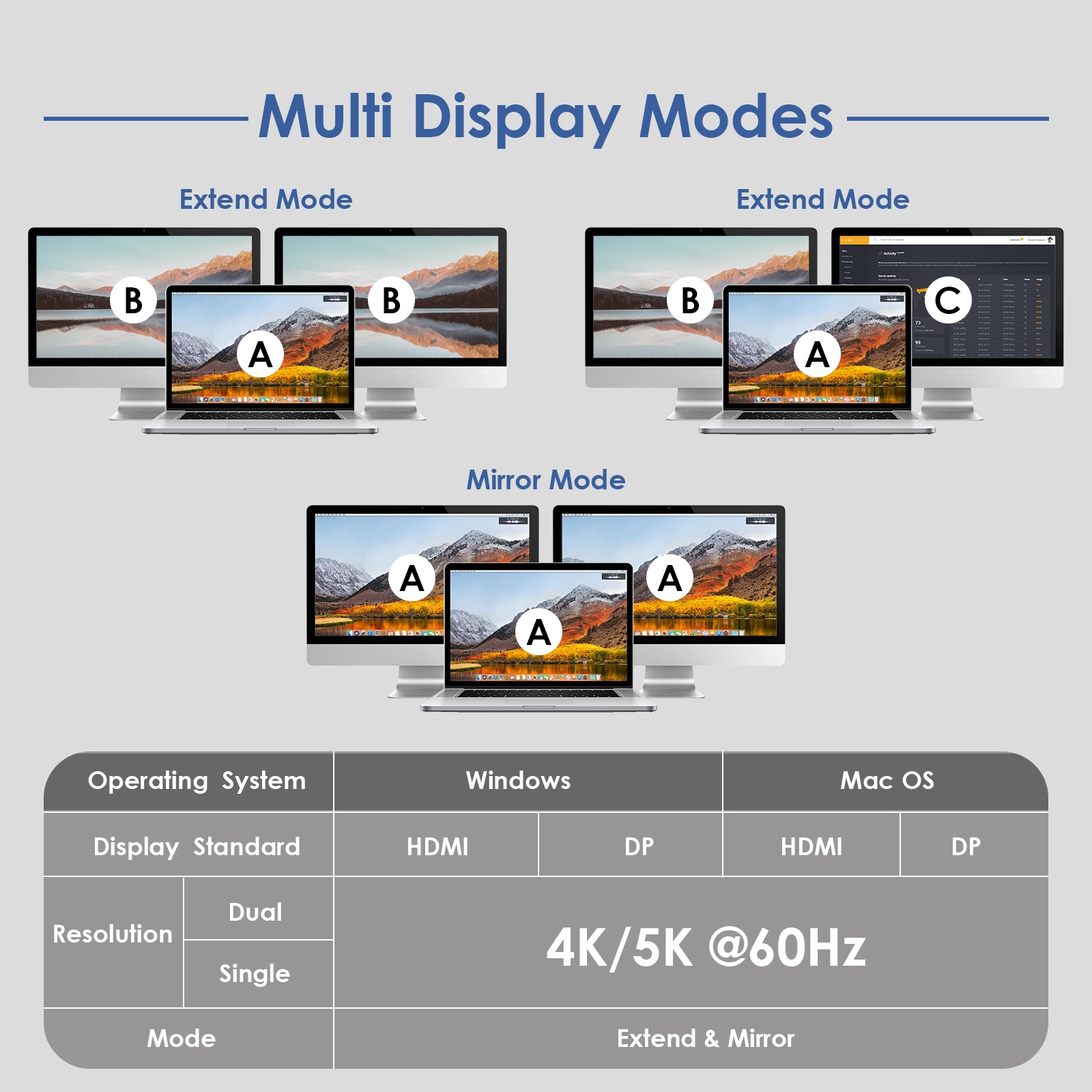 Док-станція оснащена кількома відеоінтерфейсами, портом USB-C для високошвидкісної передачі даних, багатофункціональним портом USB, Gigabit Ethernet порт і функція заряджання PD тощо, щоб ви могли бути організованими та ефективними на своєму робочому місці.
