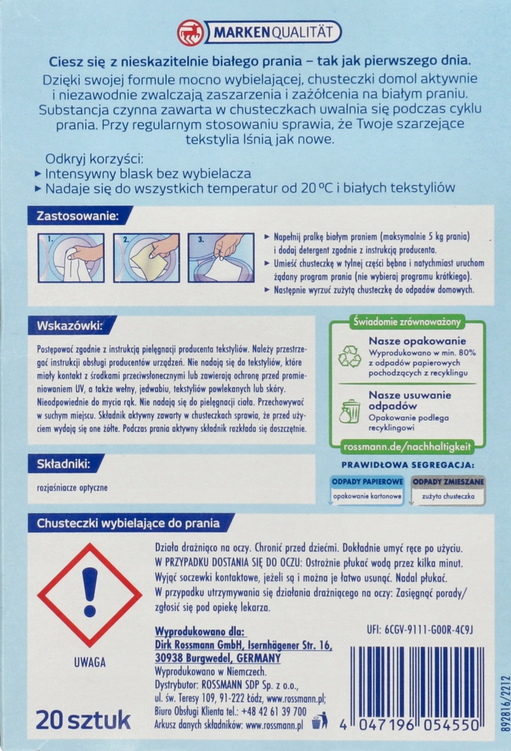 Завдяки моновідбілювальній формулі серветки Domol активно й надійно борються з посивінням і жовтизною білої білизни. Активна речовина, що міститься в серветках, виділяється під час циклу прання. За регулярного використання ваші посивілі тканини сяють як нові.