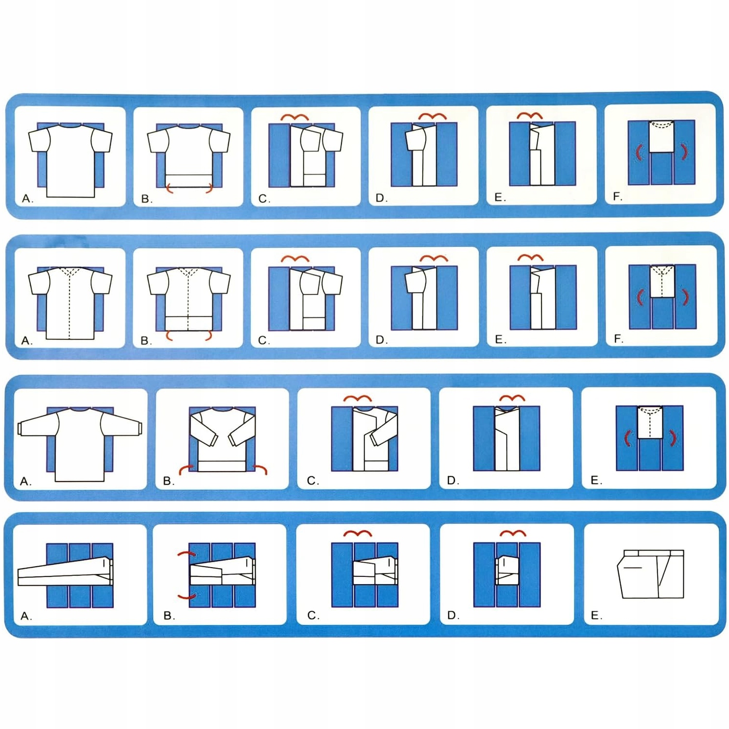 незалежно від того, чи є вони сорочками, спідницями, штанами, пальто, куртками, шортами, піжамою, светрів, ви можете акуратно скласти їх, як книга, заощаджуючи багато місця в шафі.