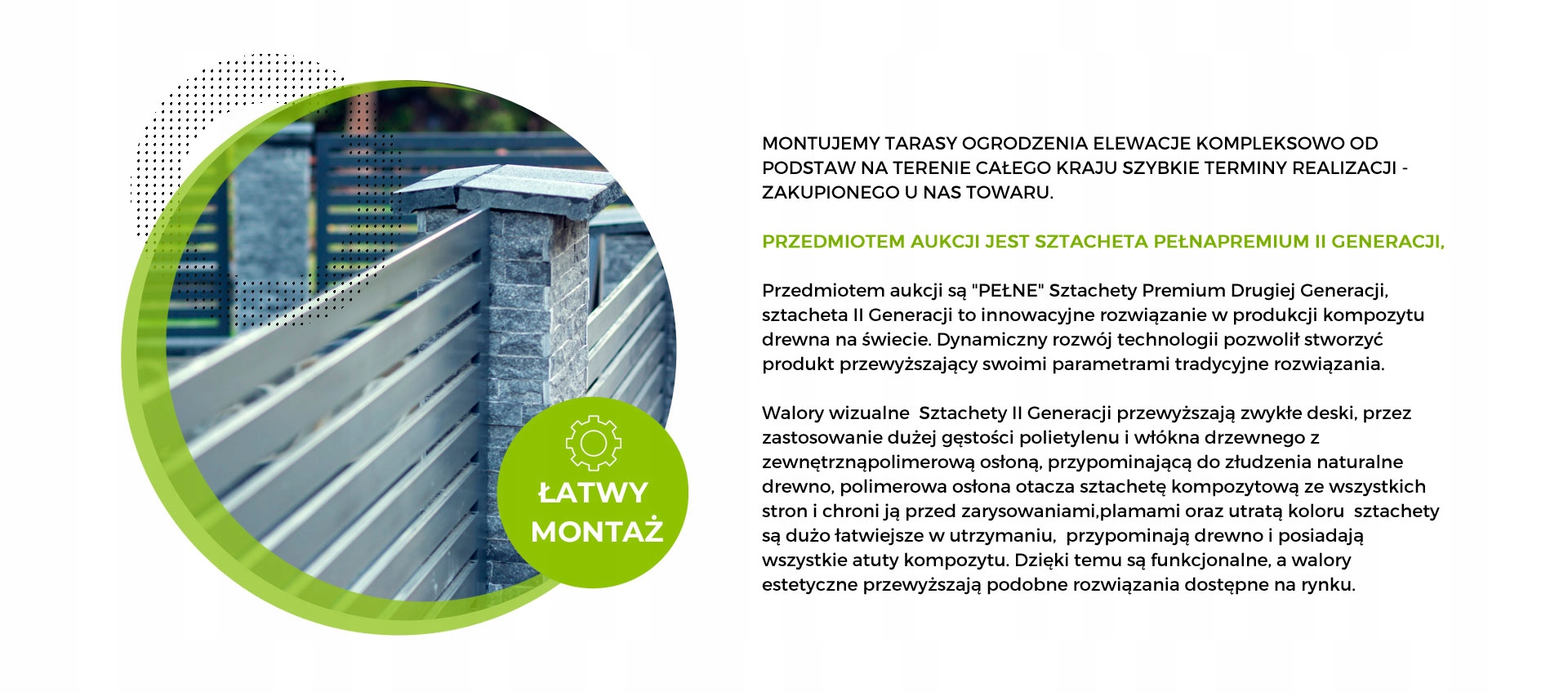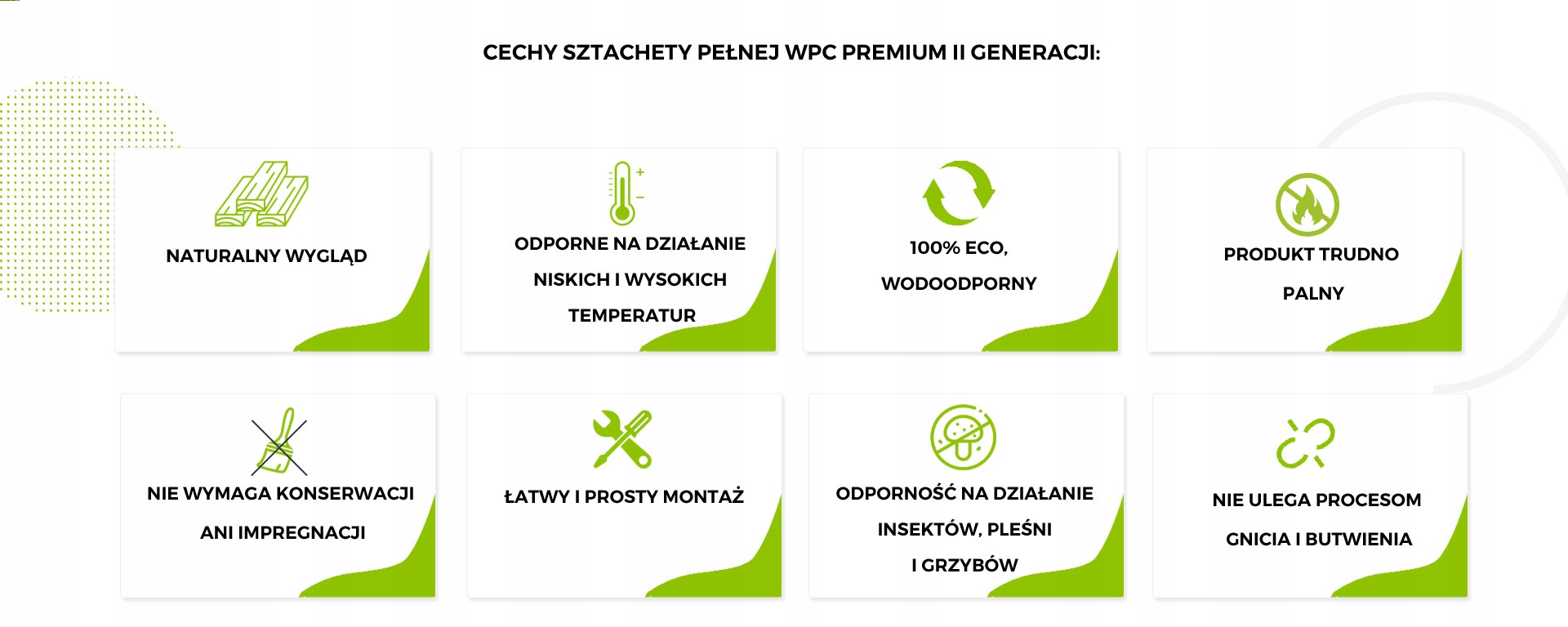 Візуальні якості перевершують звичайні пікети, що робить пікети другого покоління набагато простішими в обслуговуванні, схожості. деревини і володіють усіма перевагами композиту. Завдяки цьому його функціональні та естетичні цінності перевищують аналогічні рішення, доступні на ринку. ХІТ 2022 РОКУ.