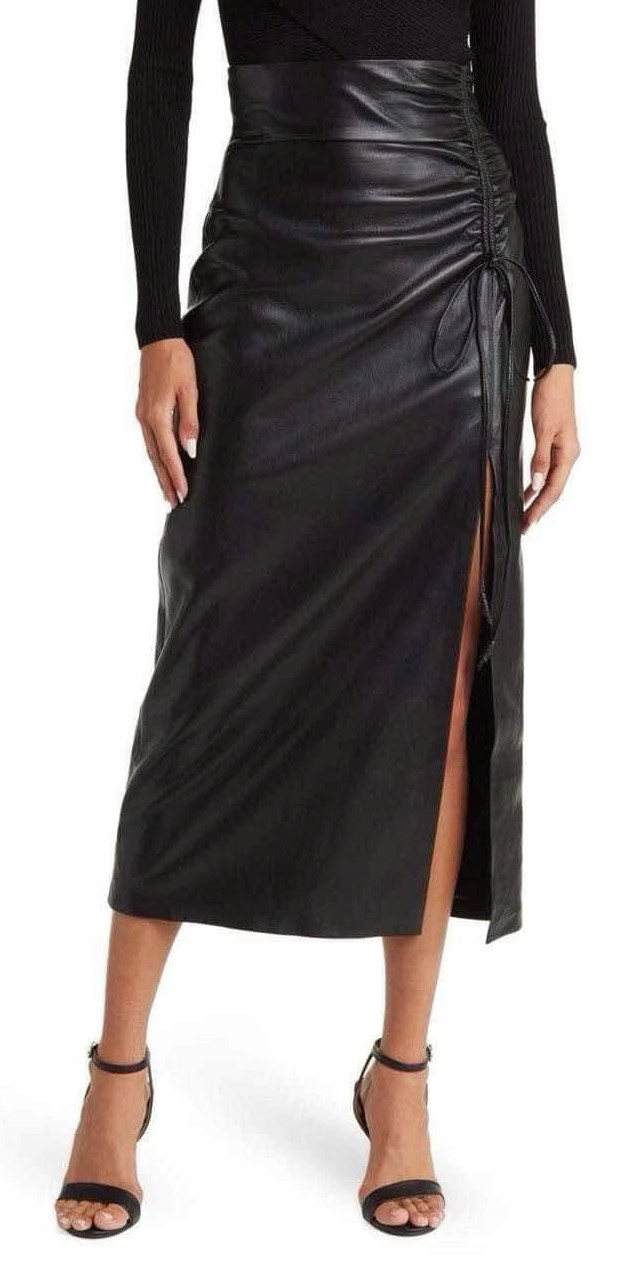 Довга вощена спідниця з боковим розрізом. Виготовлені з екологічної шкіри, ззаду застібаються на блискавку. Довга спідниця — це класичний елемент гардеробу, який додає вашому образу невимушений шарм і комфорт. Ця спідниця є одночасно модним і практичним рішенням для багатьох випадків.
